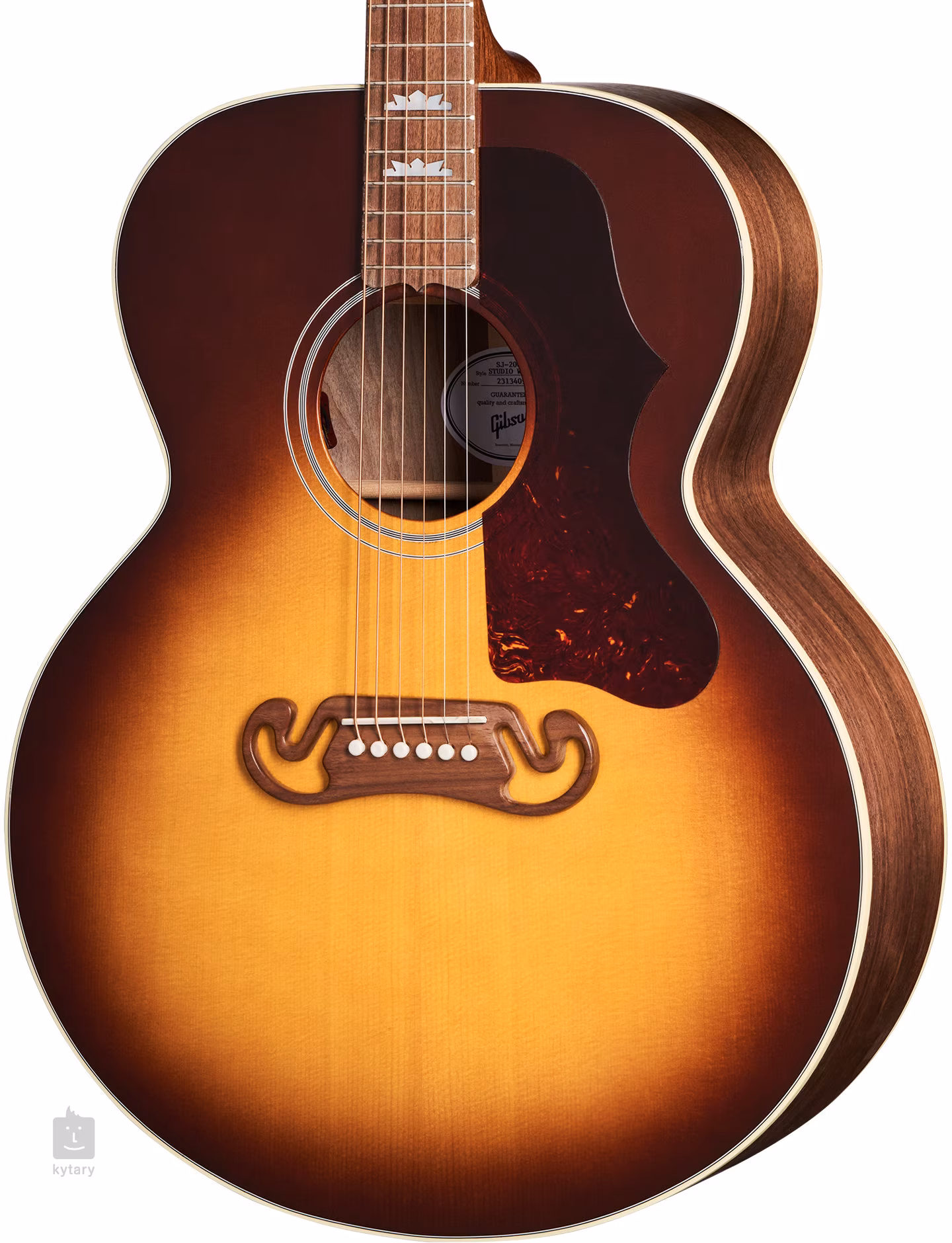 Płyta przednia gitary elektroakustycznej SJ-200 Studio Walnut Walnut Burst jest wykonana z litego drewna świerku sitka, natomiast płyta tylna i boki są wykonane z litego drewna orzecha. Połączenie tych materiałów oraz standardowa głębokość dużego korpusu typu Super Jumbo zapewniają gitarze zrównoważone, bogate brzmienie o doskonałej głośności i projekcji, którego barwa plasuje się gdzieś pomiędzy jasnością klonu a głębią palisandru. Rezonans płyty przedniej wspierają ręcznie wyfrezowane żebra typu X, a korpus pokrywa cienka warstwa lakieru nitrocelulozowego (płyta przednia na połysk, płyta tylna i boki na mat).