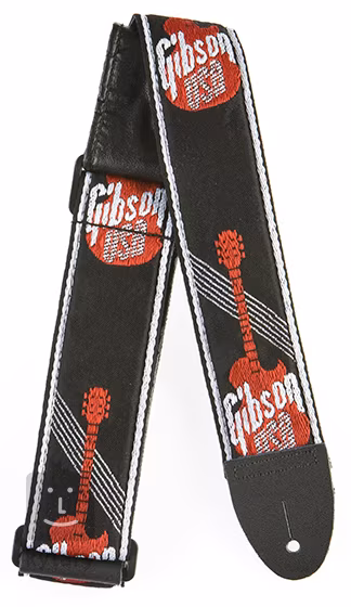 Tkany pasek do gitary z haftowanym logo Gibson w stylu vintage.