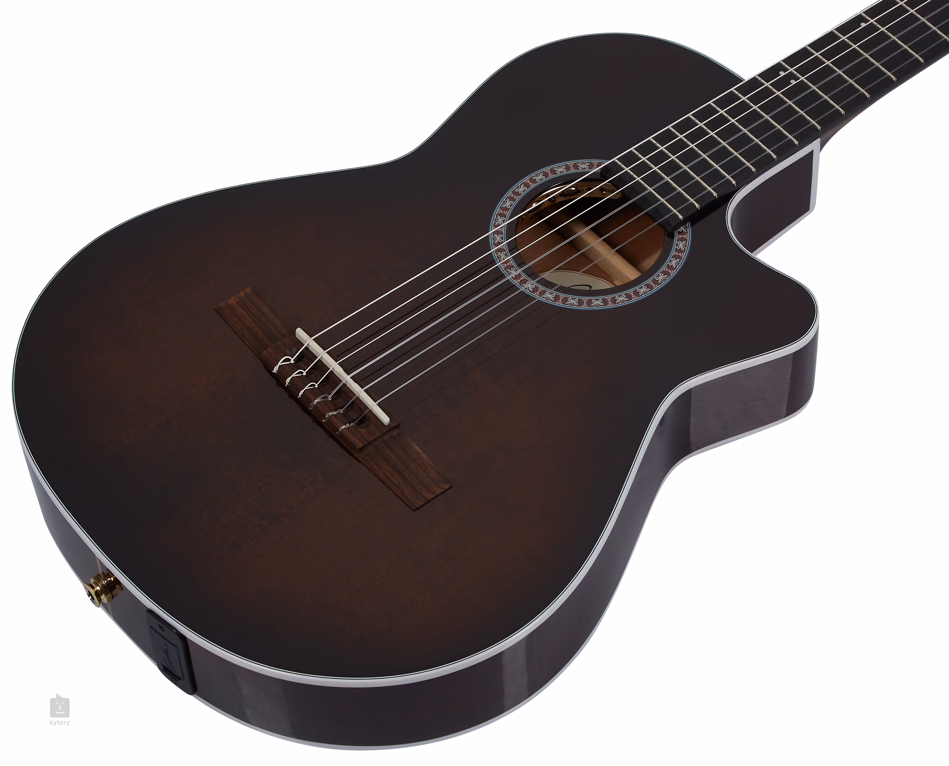 W przypadku pełnomasowego modelu Arena Pro CW Bourbon Burst EQ jest to instrument typu thinline z płytą przednią wykonaną z testowanego ciśnieniowo litego świerku. Masz gwarancję, że drewno gitary będzie stabilne i jednocześnie będzie pięknie rezonować. Lity świerkowy top jest uzupełniony przez lity mahoń na tylnej części i bokach. Do mahoniowej szyjki przyklejona jest podstrunnica z nowoczesnego kompozytu richlite wyposażona w dziewiętnaście progów. Dobre dopasowanie na najwyższych pozycjach podstrunnicy ułatwia głębokie, zaokrąglone wycięcie dolnej części korpusu.
