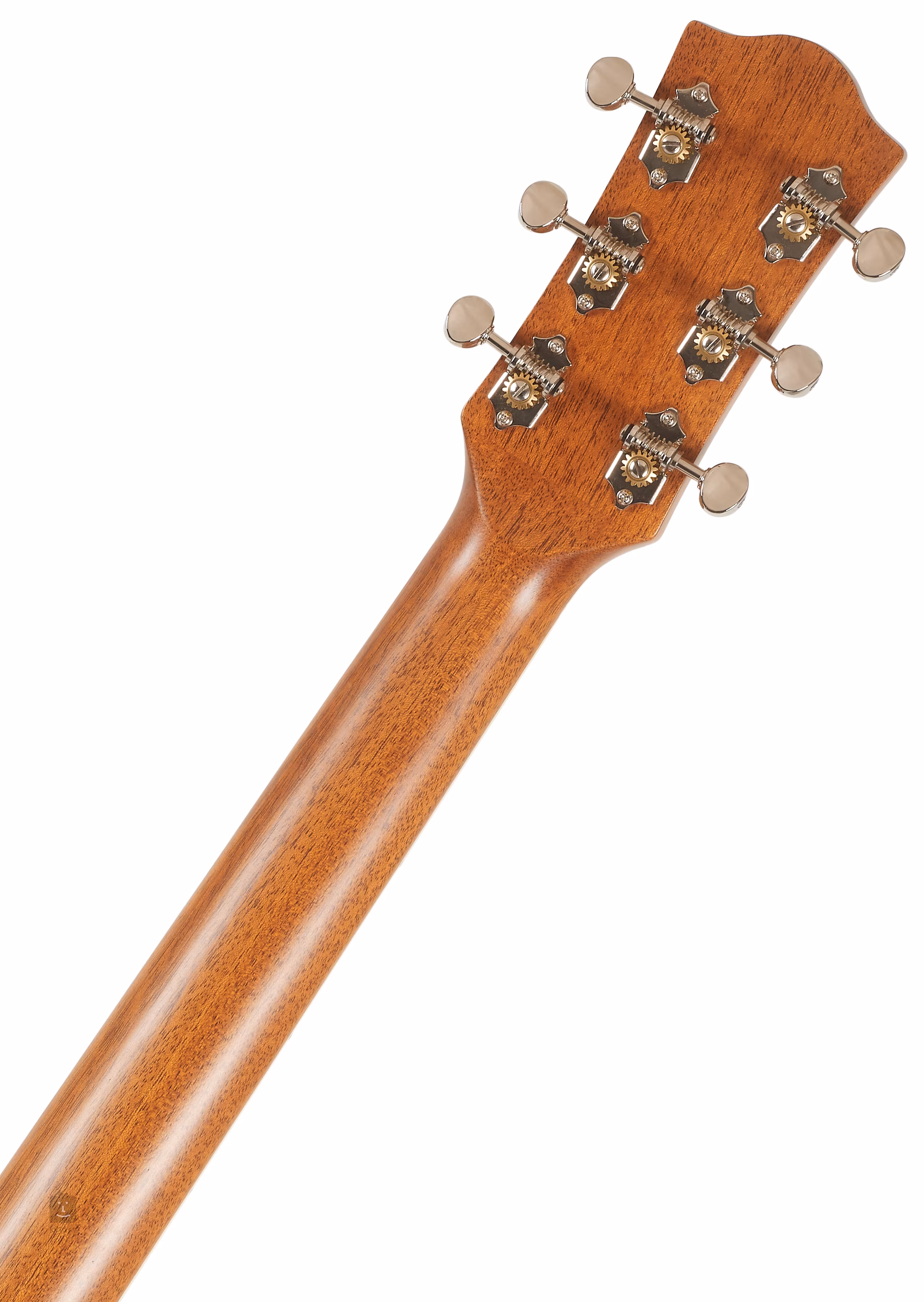 Przód gitary wykonany jest ze świerku Sitka, który jest uzupełniony mahoniem z tyłu i po bokach. Połączenie litego drewna gwarantuje rezonansowe brzmienie, a instrument będzie zyskiwał na barwie wraz z upływem lat. Mahoniowa szyjka jest przyklejona do palisandrowej podstrunnicy wyposażonej w dwadzieścia jeden progów średniej wielkości. Orientację na powierzchni podstrunnicy ułatwiają kropki pozycjonujące i charakterystyczna wkładka na dwunastym progu.