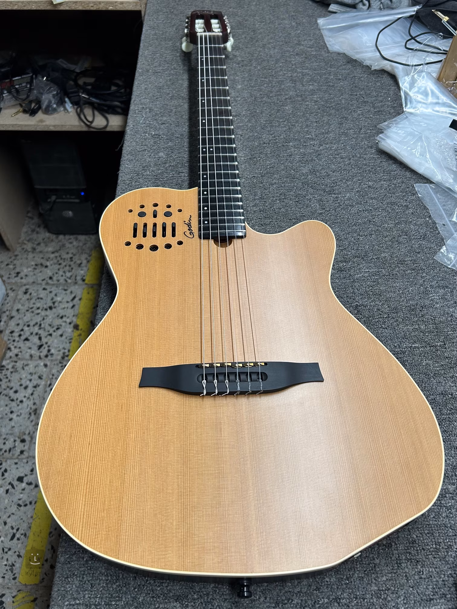 Seria Multiac kanadyjskiej marki Godin oferuje nietypowe modele hybrydowych instrumentów elektroakustycznych o niezwykłych możliwościach brzmieniowych i ciekawym wyglądzie. Podstawą brzmienia modelu Multiac ACS-SA SLIM Nylon Natural SG jest korpus z komorowego klonu srebrzystego i lity top z cedru. Do przykręcanej mahoniowej szyjki przyklejony jest palisander z nowoczesnego materiału kompozytowego richlite, wyposażony w dwadzieścia dwa progi. Ogólne parametry, tj. wąski korpus, wąski gryf (szerokość progu zerowego 43,18 mm) i bardziej płaska podstrunnica (promień 16 cali), będą szczególnie odpowiadać muzykom przyzwyczajonym do wymiarów gitar elektrycznych. Dzięki komorowej konstrukcji korpusu gitara jest całkowicie odporna na sprzężenie zwrotne, więc nawet głośne koncerty z zespołem nie stanowią problemu. Dźwięk jest rejestrowany za pomocą niestandardowego przedwzmacniacza marki L. R. Baggs i sześciu indywidualnych kamieni piezoelektrycznych. Oprócz standardowego wyjścia jack 6,3 mm gitara oferuje również 13-pinowe złącze do podłączenia syntezatorów Roland GR i większości innych urządzeń wyposażonych w 13-pinowe złącze. Nylonowe struny gitary są zamocowane przez zerowy próg Graphtech w klasycznych otwartych mechanizmach strojących o przełożeniu 16:1 i mostku z richlite. Instrument jest dostarczany w pokrowcu (gig bag).
