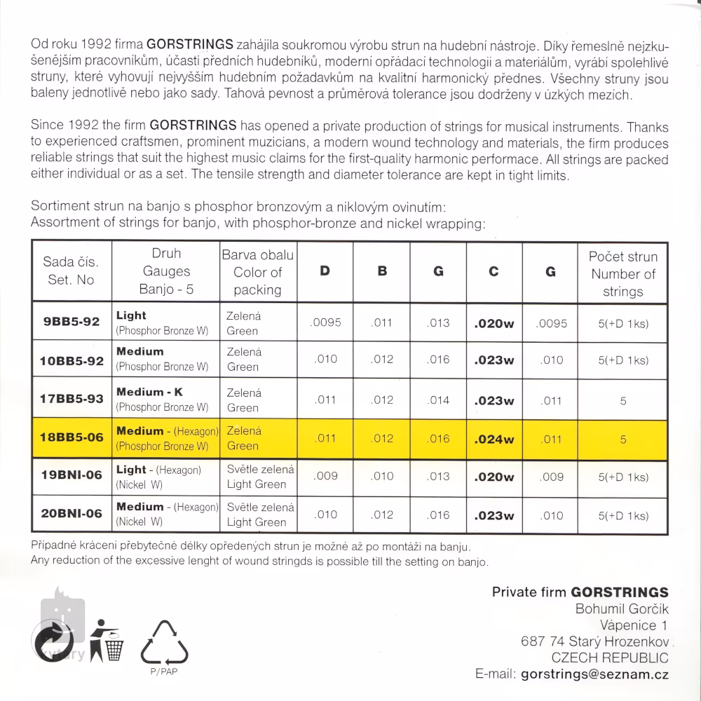 Struny do pięciostrunowego banjo od czeskiego producenta Gorstrings oferują bardzo czyste i specyficzne brzmienie, długą żywotność i niezawodną stabilność strojenia. Ich sześciokątny stalowy rdzeń jest nawinięty popularnym stopem fosforowo-brązowym, co nadaje im ciepły i zaokrąglony charakter. Jeśli szukasz strun na ognisko lub występ country, ten zestaw może być dla Ciebie właściwym wyborem. Struny wykonane są z najwyższej jakości materiałów i przeszły przez ręce najlepszych czeskich rzemieślników. Daj swojemu instrumentowi to, co najlepsze z Gorstrings!