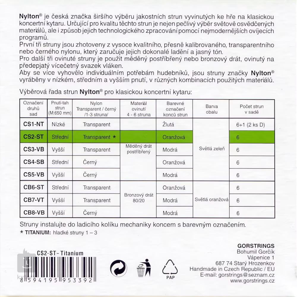 Nylonowe struny do gitary klasycznej z serii Nylton od czeskiego producenta Gorstrings wykonane zostały ze sprawdzonych na całym świecie materiałów przy użyciu najnowszych technologii. Bazują one na wysokiej jakości, precyzyjnie skalibrowanym rdzeniu z przezroczystego nylonu Titanium, który owinięty jest popularną w przypadku strun basowych posrebrzaną miedzią - nadaje to strunom ciepłe, zbalansowane częstotliwościowo brzmienie, które doskonale sprawdza się zarówno podczas domowych ćwiczeń, gry na koncertach, jak i nagrań studyjnych. Struny zostały wykonane przez najlepszych czeskich rzemieślników. Zestaw ten oferuje średni naciąg.