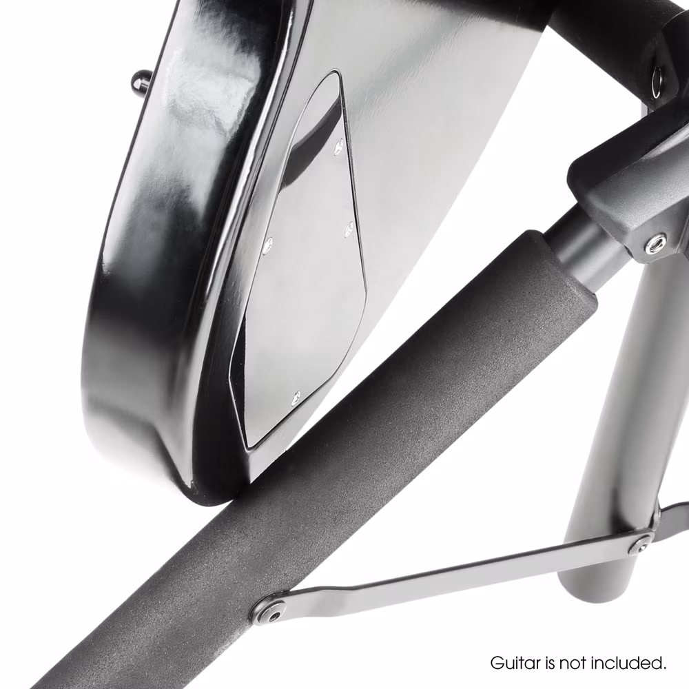 Ten statyw może być używany do gitar elektrycznych, akustycznych, klasycznych i basowych. Oczywiście posiada regulację wysokości i ochronną wyściółkę, która zapobiega przesuwaniu się instrumentu i jednocześnie chroni lakier. Kolejną funkcją ochronną jest samoblokujący się uchwyt na szyję, dzięki czemu Twój ulubiony instrument jest dobrze chroniony przed wszystkimi typowymi pułapkami.