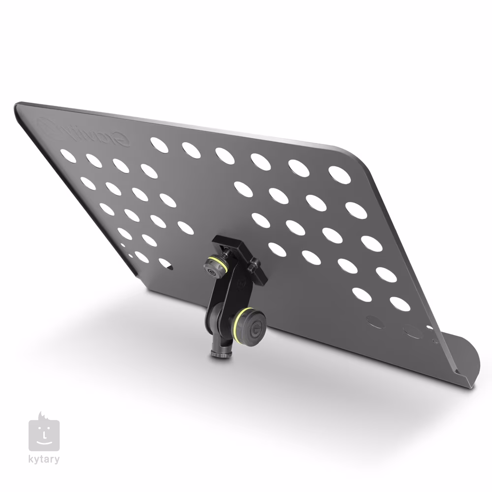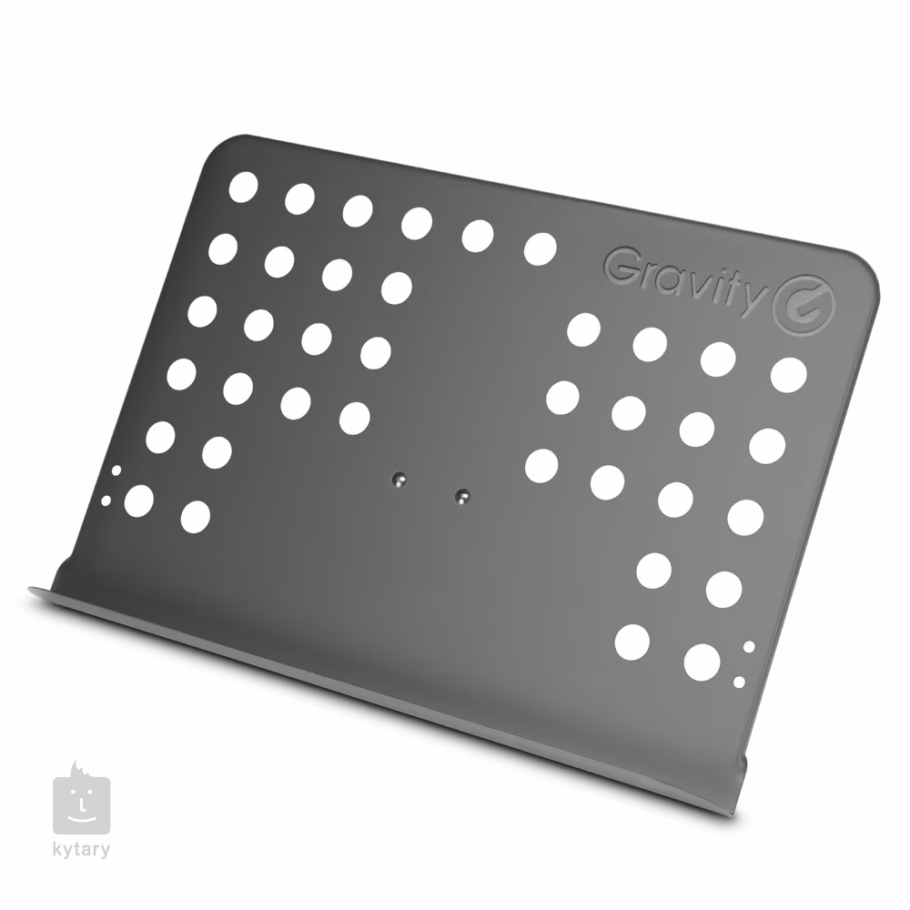 Statyw muzyczny marki Gravity z adapterem (gwint 3/8 cala), który łatwo mocuje statyw muzyczny do standardowych statywów mikrofonowych i zamienia je w funkcjonalne statywy muzyczne. Perforowany stojak na nuty wykonany jest ze stali malowanej na czarno (wymiary 340 x 475 mm), wszystkie ergonomicznie ukształtowane elementy sterujące (zaciski) wykonane są z ABS/nylonu i pokryte termoplastycznym tworzywem dla łatwej, szybkiej i płynnej regulacji.