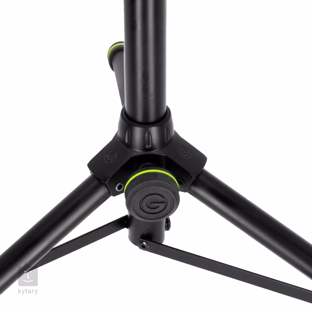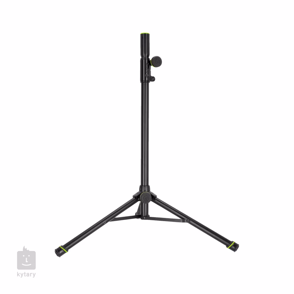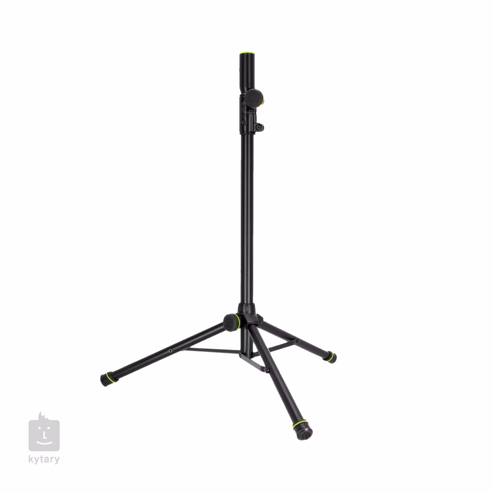 Kompaktowy statyw głośnikowy z aluminiową konstrukcją, regulowaną wysokością i wymiennymi kolorowymi pierścieniami.