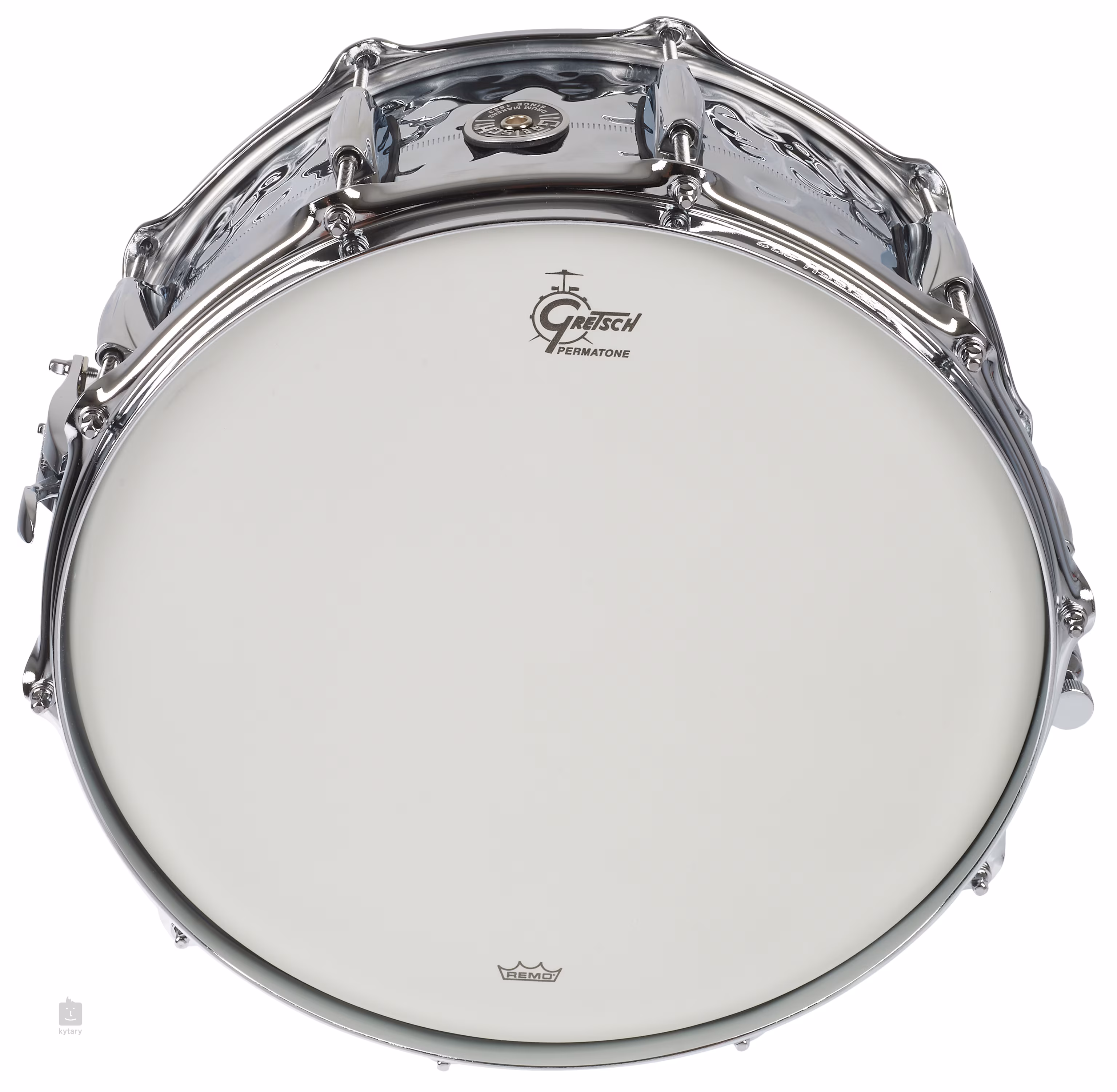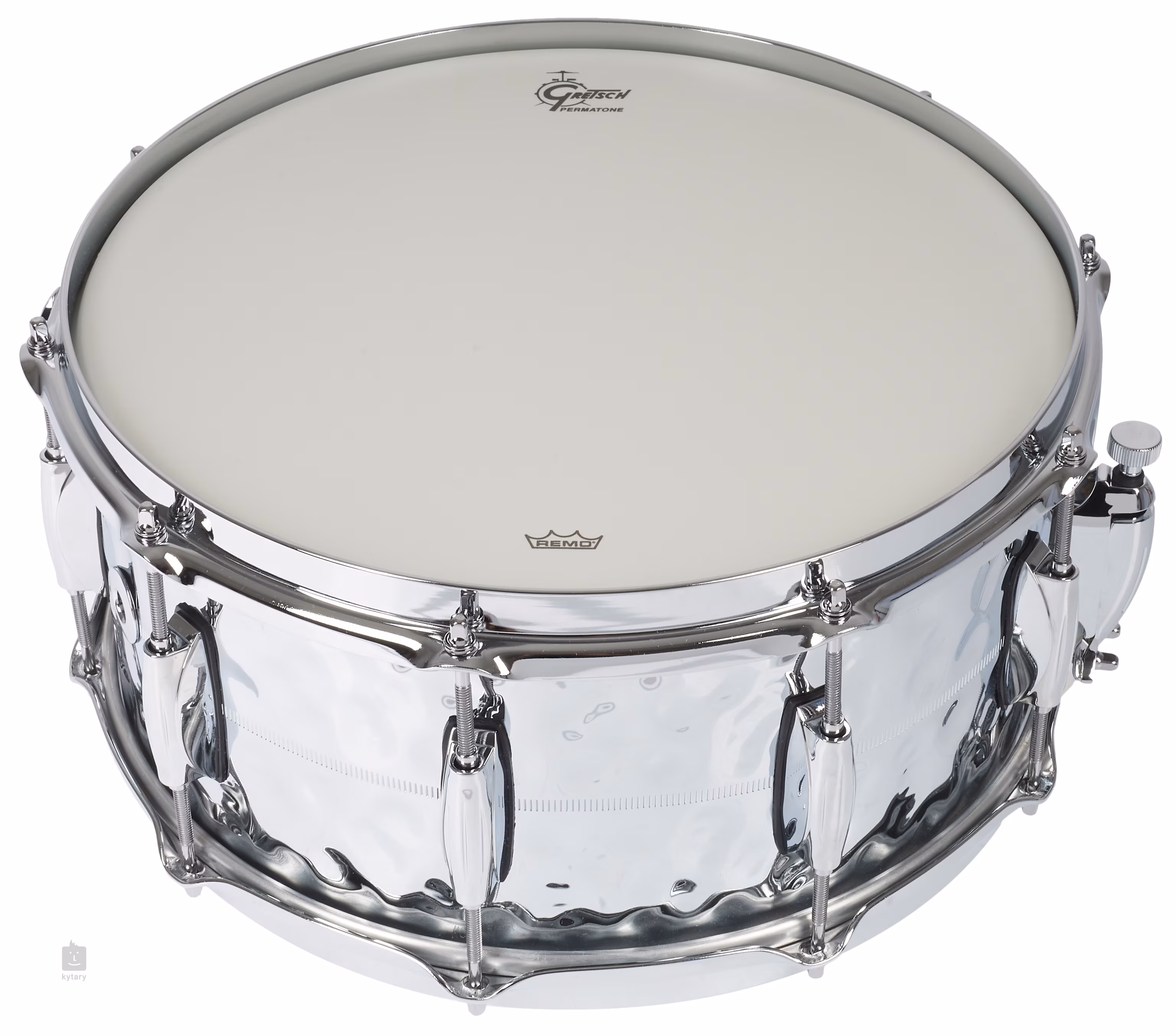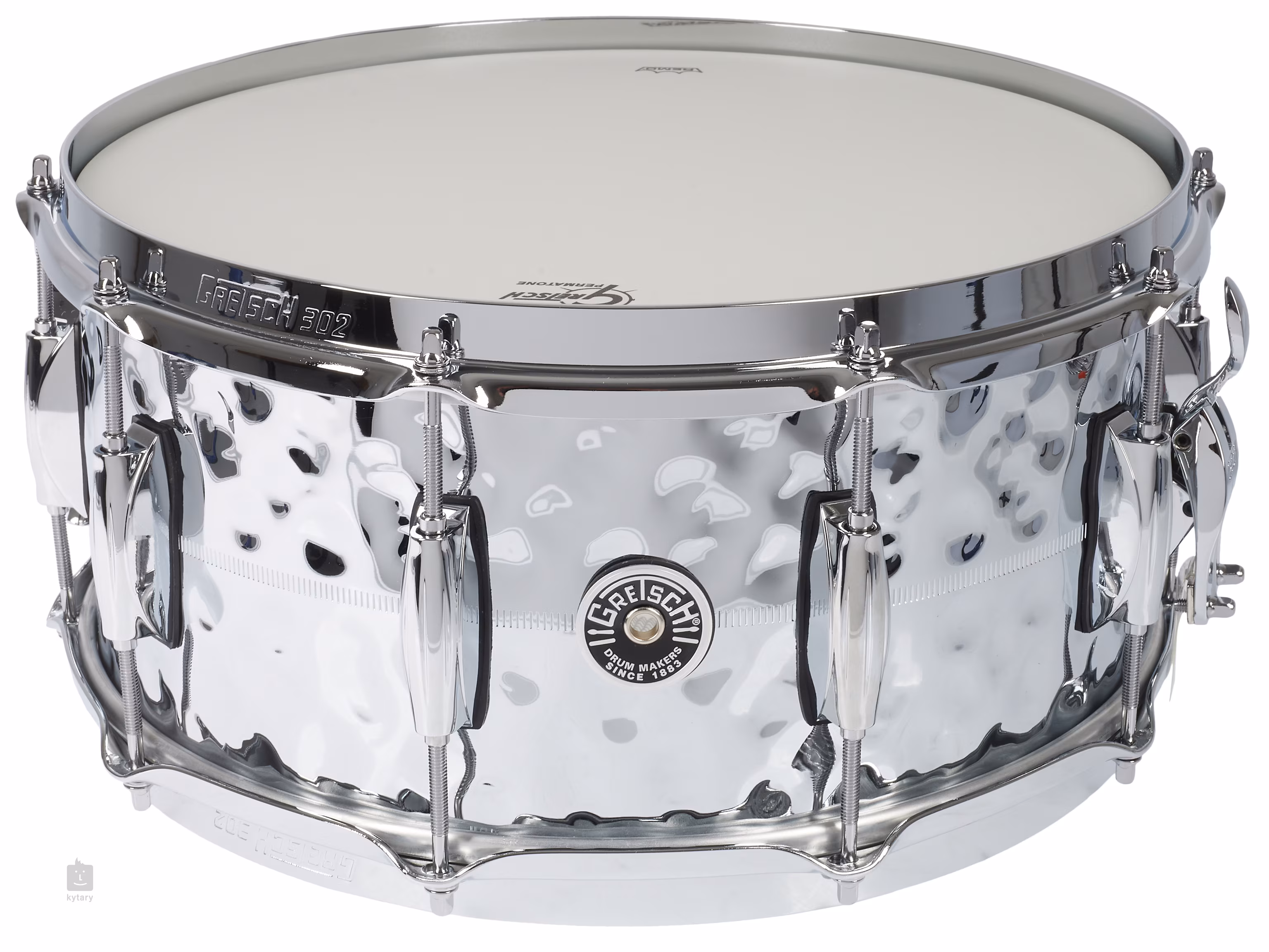 Gretsch 14 "x6,5" Hammered Chrome Over Brass to werbel z amerykańskiej serii Brooklyn z korpusem z młotkowanego chromowanego mosiądzu (1,2 mm).Obrzeże 45°, stalowa obręcz Gretsch '302', stroke: lightning, membrany Remo.