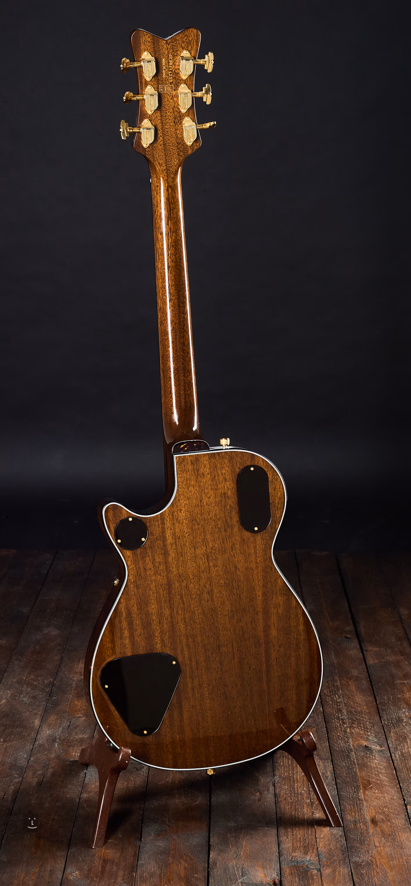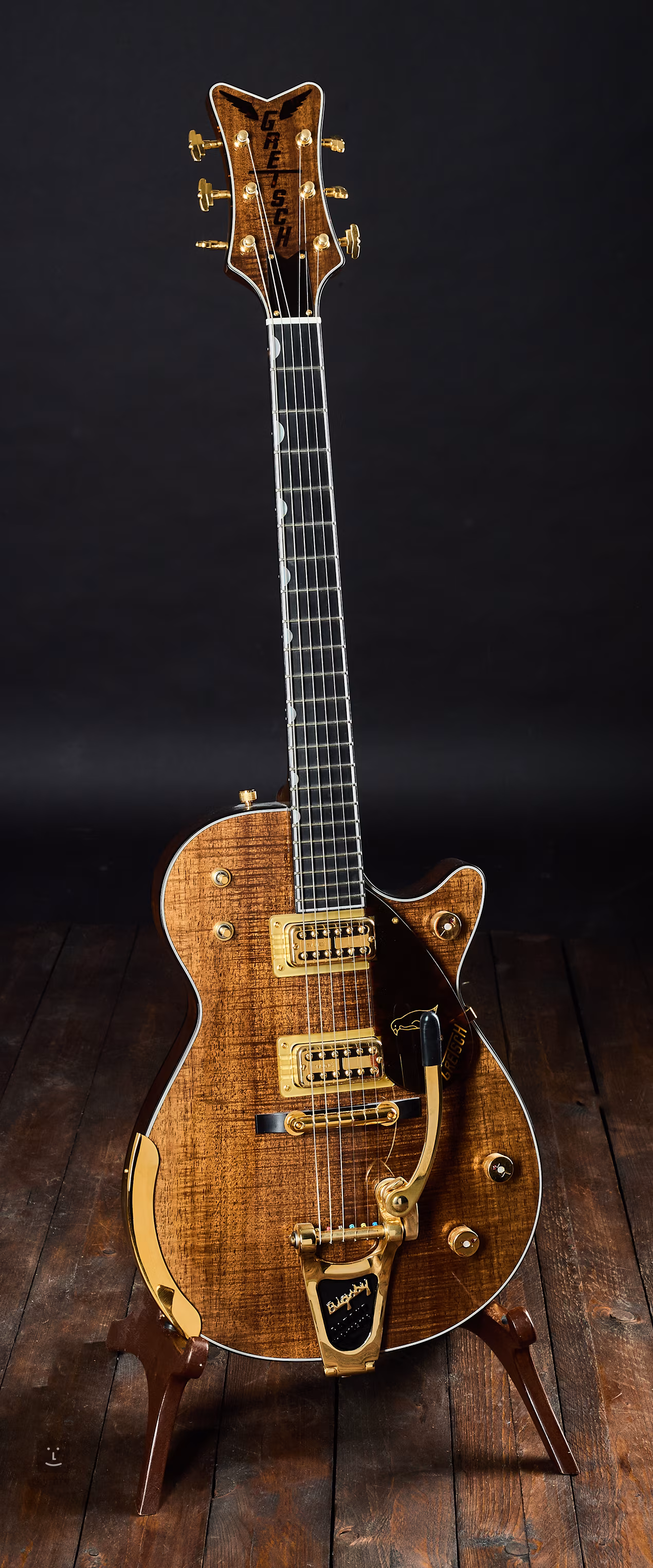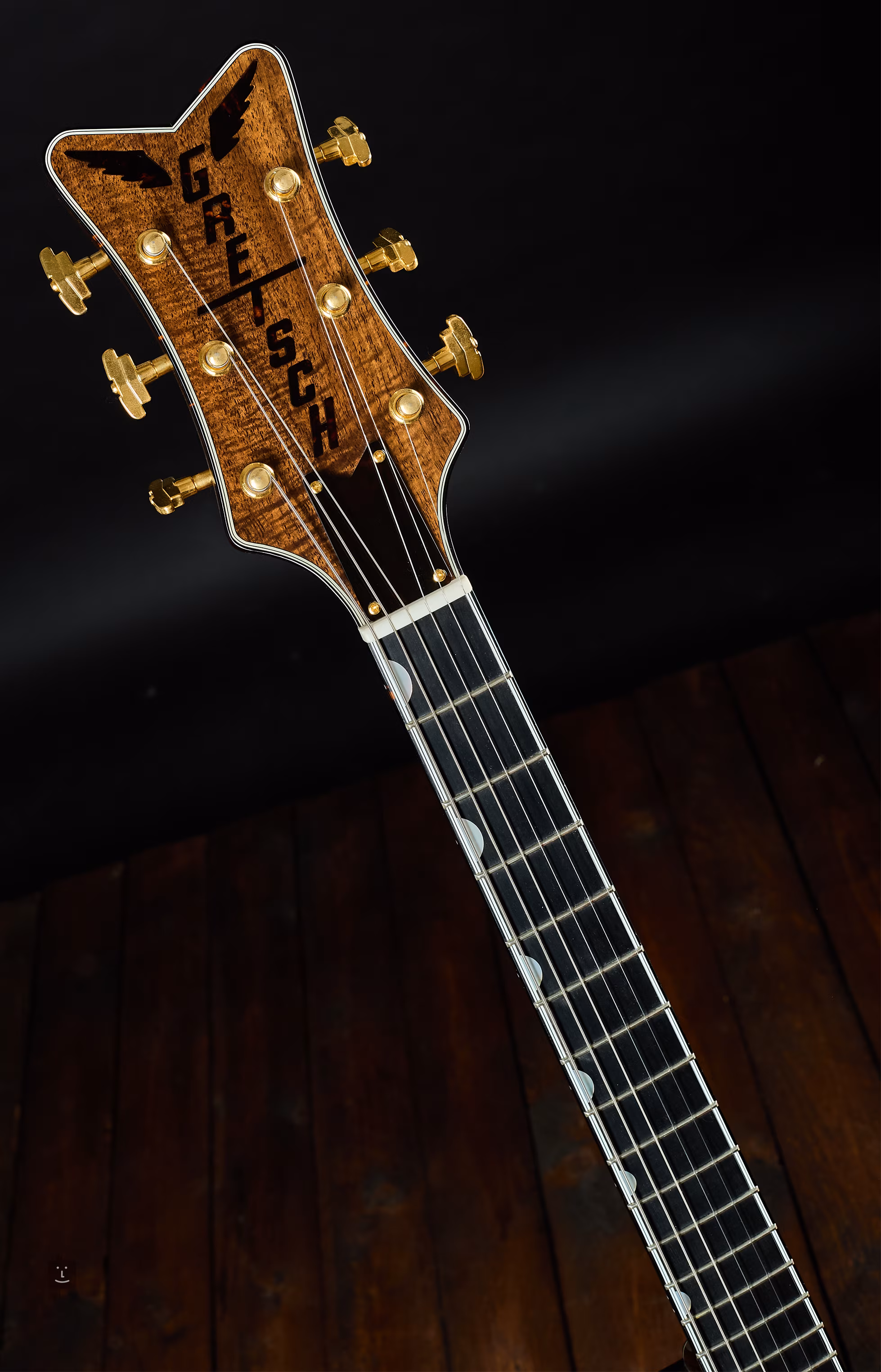 Komorowy mahoniowy korpus gitary w stylu Gretsch's single-cut Penguin jest ozdobiony łukowatym topem wykonanym z laminowanego hawajskiego drewna koa. Do mahoniowej szyjki przyklejona jest hebanowa podstrunnica wyposażona w dwadzieścia dwa progi Medium Jumbo. Orientację po powierzchni podstrunnicy ułatwiają wykonane z masy perłowej znaczniki pozycji (Mother-of-Pearl Neo-Classical Thumbnail). Dwa humbuckery TV Jones Classic nadają gitarze jasne brzmienie z esencją czystej rock'n'rollowej drapieżności, które świetnie sprawdza się także w country, rockabilly i innych pokrewnych gatunkach. Kontrolery w postaci trójpozycyjnego przełącznika pickupów, dwóch potencjometrów głośności pickupów, potencjometru Master Volume oraz trójpozycyjnego przełącznika tone shutter oferują szeroki zakres ustawień brzmieniowych. Precyzyjne i stabilne strojenie jest gwarantowane przez zakotwiczenie strun za pomocą kostnego progu zerowego w maszynkach do strojenia Grover Imperial oraz przez mostek Rockin Bar osadzony na hebanowej podstawie w wibratorze Bigsby B3GB. Stylowy wygląd podkreśla wykończony na złoto osprzęt, w tym nakładki potencjometrów G-arrow i podłokietnik, fornir koa na główce i korpusie oraz imitacja pickguardu z żółwiej skorupy.