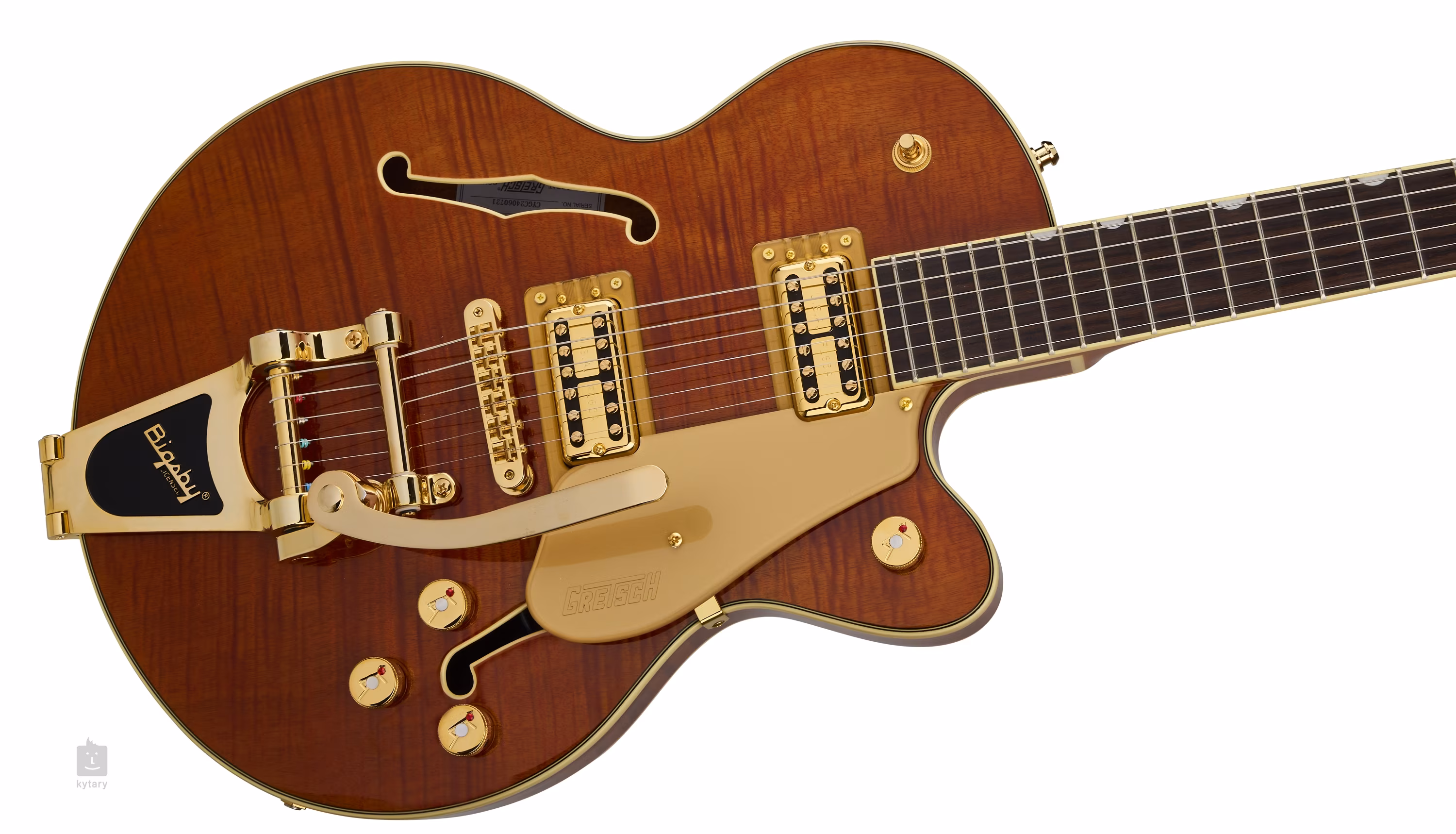 Struny trzymane są w blokujących napędach odlewanych ciśnieniowo i przez strunnik Adjusto-Matic w licencjonowanym tremolo Bigsby B70. Stylowe wykończenie podkreślają złote okucia i pickguard Gold Plexi ze złotym logo Gretsch.
