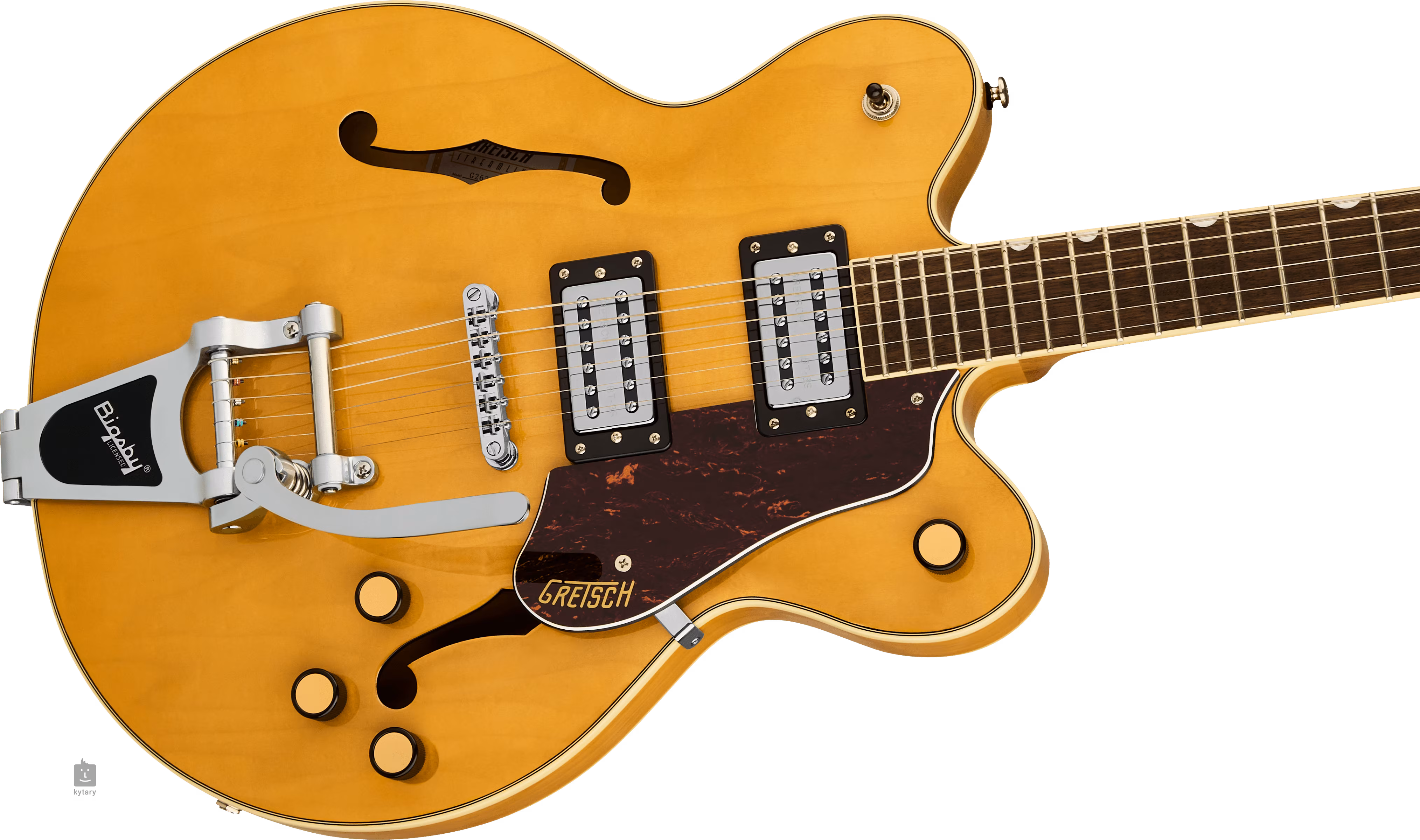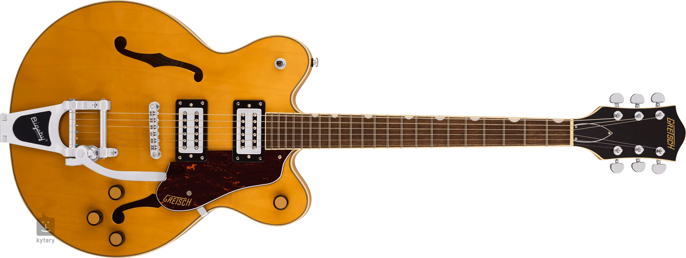 Struny są zakotwiczone za pomocą kostnego progu zerowego w odlewanych maszynkach do strojenia firmy i za pomocą strunnika Adjusto-Matic w licencjonowanym tremolo Bigsby B70. Klasyczny, przyjemny dla oka design gitar Gretsch jest podkreślony przez szereg stylowych elementów - od łukowatej konstrukcji korpusu z otworami F, eleganckiego bindingu z subtelną nutą patyny (Aged White), niklowego osprzętu po trójwarstwowy pickguard z imitacji skorupy żółwia ze złotym logo Gretsch.
