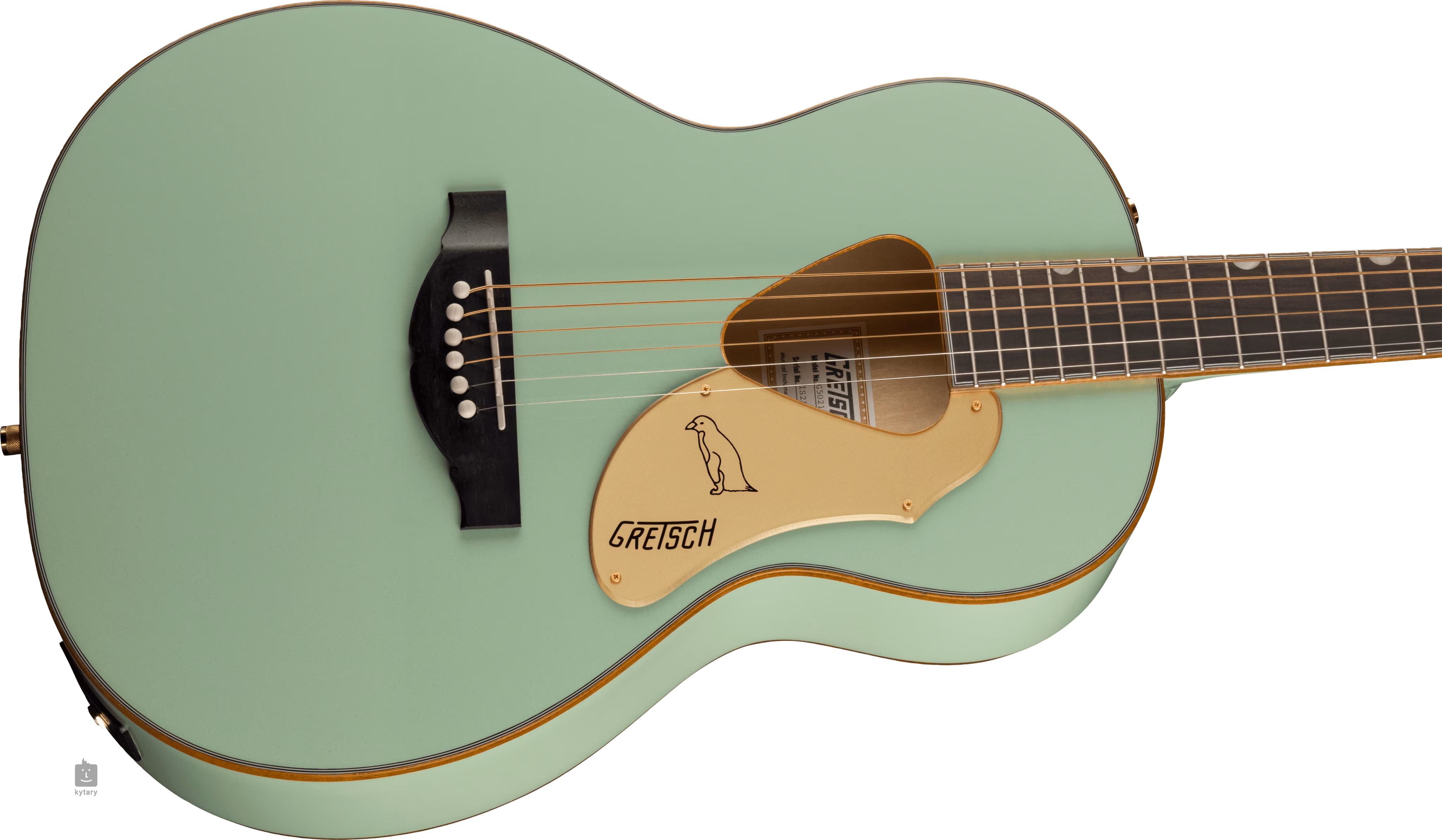 Gitary elektroakustyczne Rancher Penguin oferują przyjemnie kompaktowy korpus w stylu modeli Parlor i tradycyjną estetykę firmy. Przód modelu G5021E Rancher Penguin Parlor Mint Metallic wykonany jest z litego świerku, a tył i boki z laminowanego klonu. Palisandrowa podstrunnica z 20 progami jest przyklejona do mahoniowej szyjki o profilu "Standard U". Orientację na podstrunnicy ułatwiają przesunięte znaczniki pozycji wykonane z imitacji masy perłowej (Neo-Classic Thumbnail).