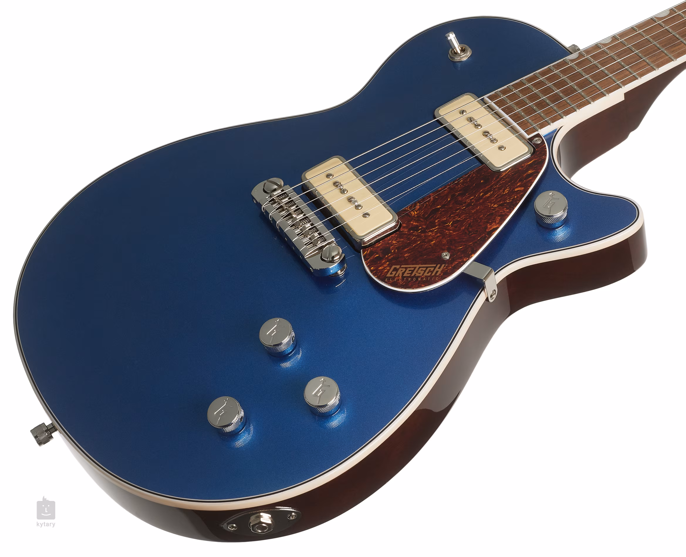 Gretsch G5210-P90 EMTC JET TWO90 FRLN z pojedynczym wycięciem należy do serii Electromatic. Komorowy mahoniowy korpus gitary ozdobiony jest łukowatym klonowym topem. Mahoniowa szyjka o profilu Thin U przyklejona jest do figowej podstrunnicy wyposażonej w dwadzieścia dwa fretki Medium Jumbo. Orientację na jej powierzchni ułatwiają przesunięte znaczniki pozycji wykonane z imitacji masy perłowej (Neo-Classic Thumbnail).