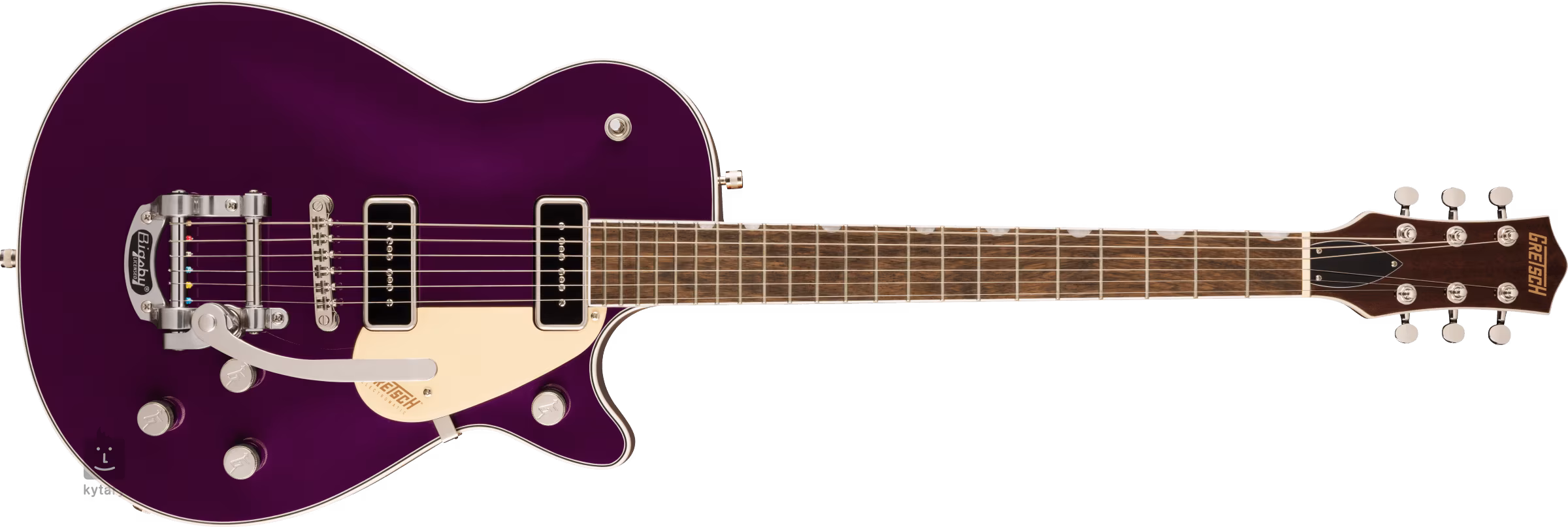 Gretsch G5210T-P90 EMTC JET TWO90 AMTHST z pojedynczym wycięciem należy do serii Electromatic. Komorowy mahoniowy korpus gitary ozdobiony jest łukowatym klonowym topem. Mahoniowa szyjka o profilu Thin U przyklejona jest do figowej podstrunnicy wyposażonej w dwadzieścia dwa fretki Medium Jumbo. Orientację na jej powierzchni ułatwiają przesunięte znaczniki pozycji wykonane z imitacji masy perłowej (Neo-Classic Thumbnail).
