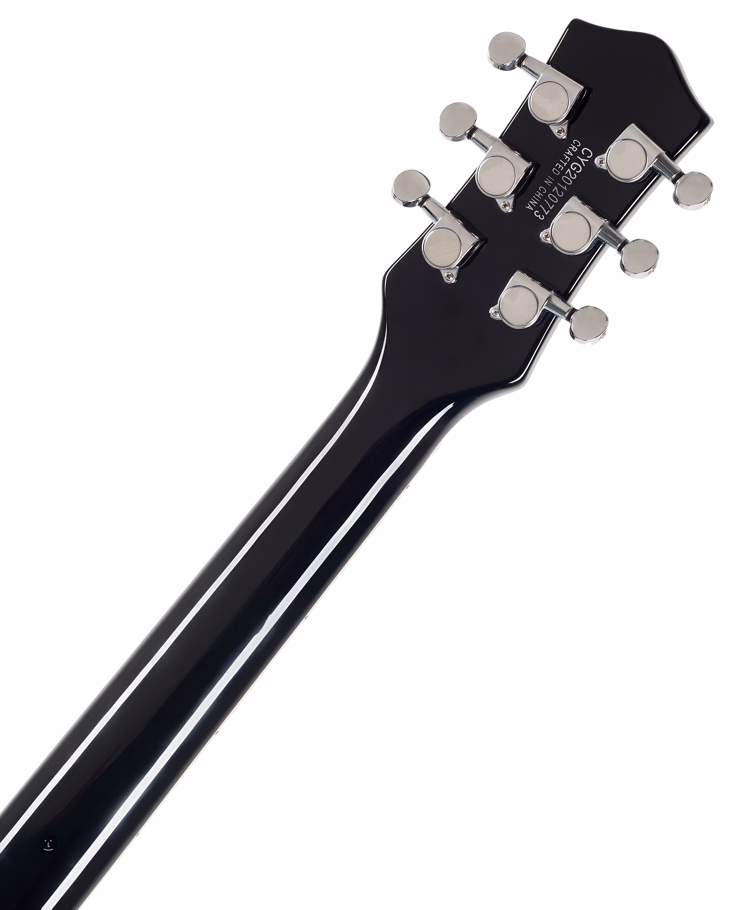 Struny są zakotwiczone poprzez podstrunnicę z kości do chromowanych mechanizmów Die-Cast, główki Adjusto-Matic i tremolo Bigsby. Stylowy, mroczny design podkreślają czarny lakierowany korpus, szyjka i główka, kontrastujący jasny binding oraz pickguard w wykończeniu Oxblood Plexi ozdobiony grafiką "TigerBat" i firmowym logo Gretscha.