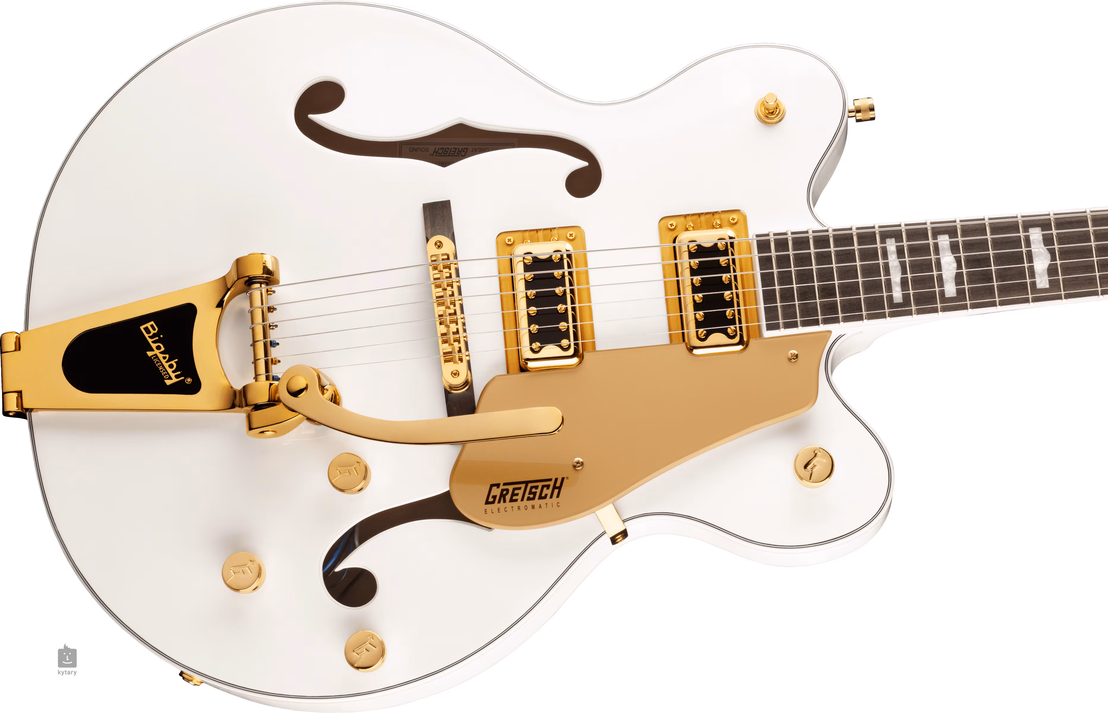 Struny są zamocowane przez zerowy próg z materiału Graph Tech NuBone w otwartych stroikach w stylu vintage oraz przez mostek Adjusto-Matic osadzony na drewnianej podstawie w licencjonowanym tremolo Bigsby B60. Stylowy wygląd gitary podkreśla kolorystyka Snowcrest White, obramowanie korpusu i główki oraz luksusowe złote wykończenie osprzętu, w tym pickguard, tremolo oraz osłony i ramki przetworników.