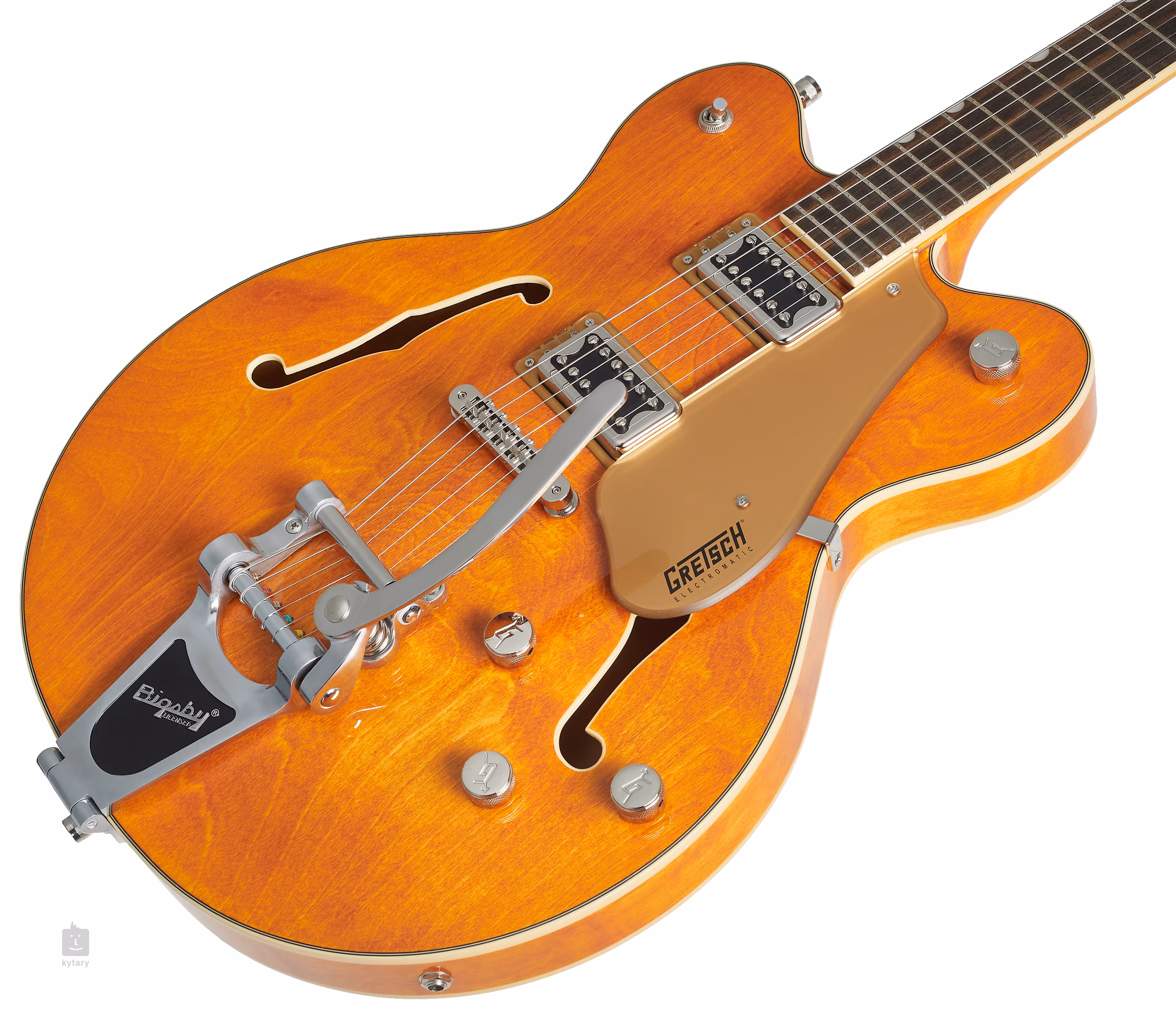 Precyzyjne strojenie jest gwarantowane przez struny mocowane za pomocą zerowego progu Graph Tech NuBone w firmowych maszynkach do strojenia Die-Cast oraz przez strunnik Adjusto-Matic w licencjonowanym tremolo Bigsby B70. Stylowy design gitary podkreślają tradycyjne elementy w postaci bindingu korpusu Aged White, niklowego osprzętu i pickguardu Gold Plexi z czarnym logo firmy Gretsch.