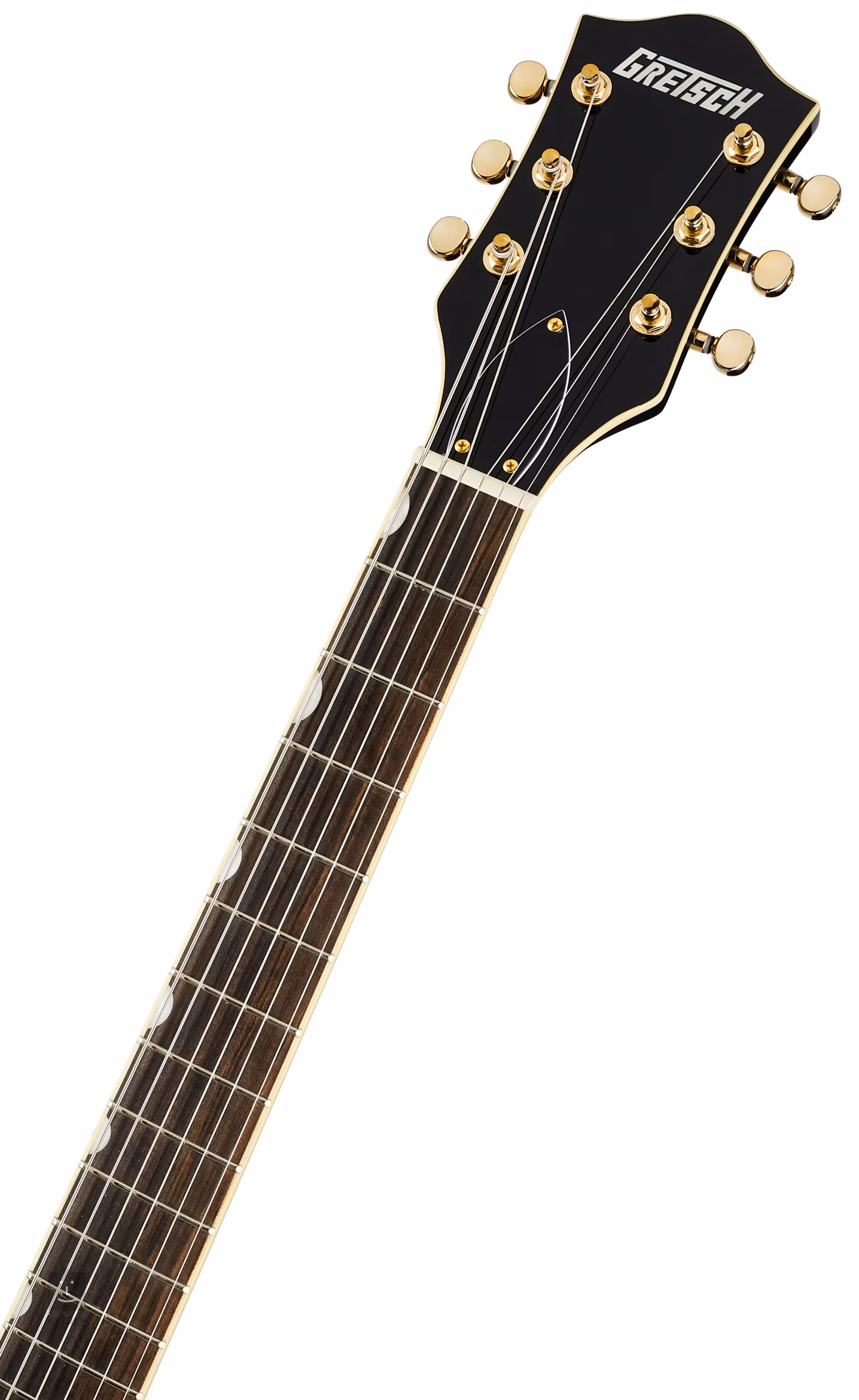 Precyzyjne strojenie jest zapewnione dzięki przełożeniu strun przez zerowy próg z kości syntetycznej w firmowych automatach stroikowych Die-Cast oraz w strunniku Adjusto-Matic zamontowanym na podstawie z litego drewna. Licencjonowane tremolo Bigsby B70 dodaje subtelne efekty dźwiękowe do Twojej gry. Klasyczny, przyjemny dla oka design gitar Gretsch jest podkreślony przez szereg stylowych cech - od łukowatej konstrukcji korpusu, eleganckiego binding'u z subtelną nutą patyny (Aged White) i czarno-białego pickguarda, błyszczącego złotego osprzętu po pickguard Gold Plexi z czarnym logo firmy Gretsch.