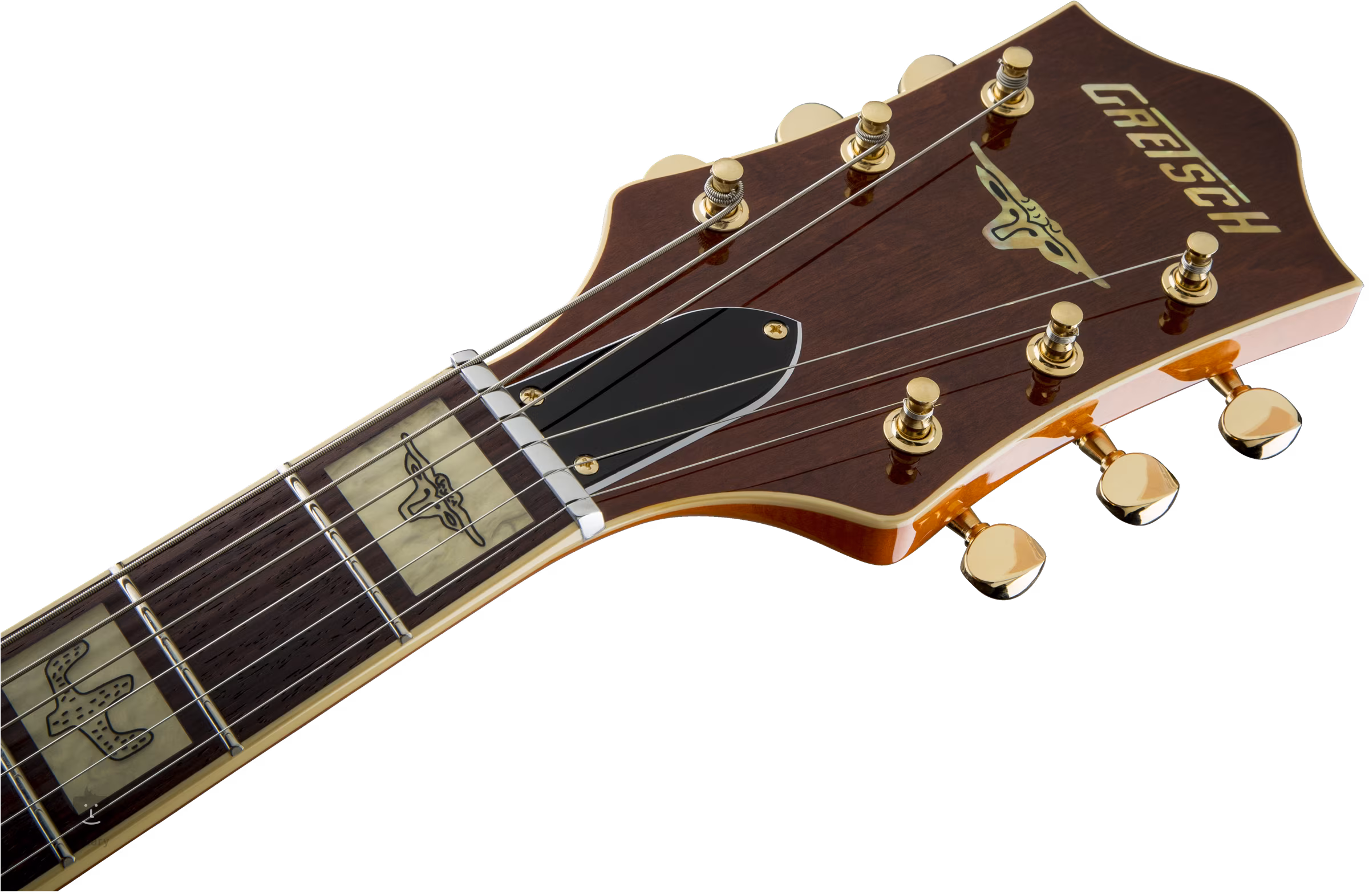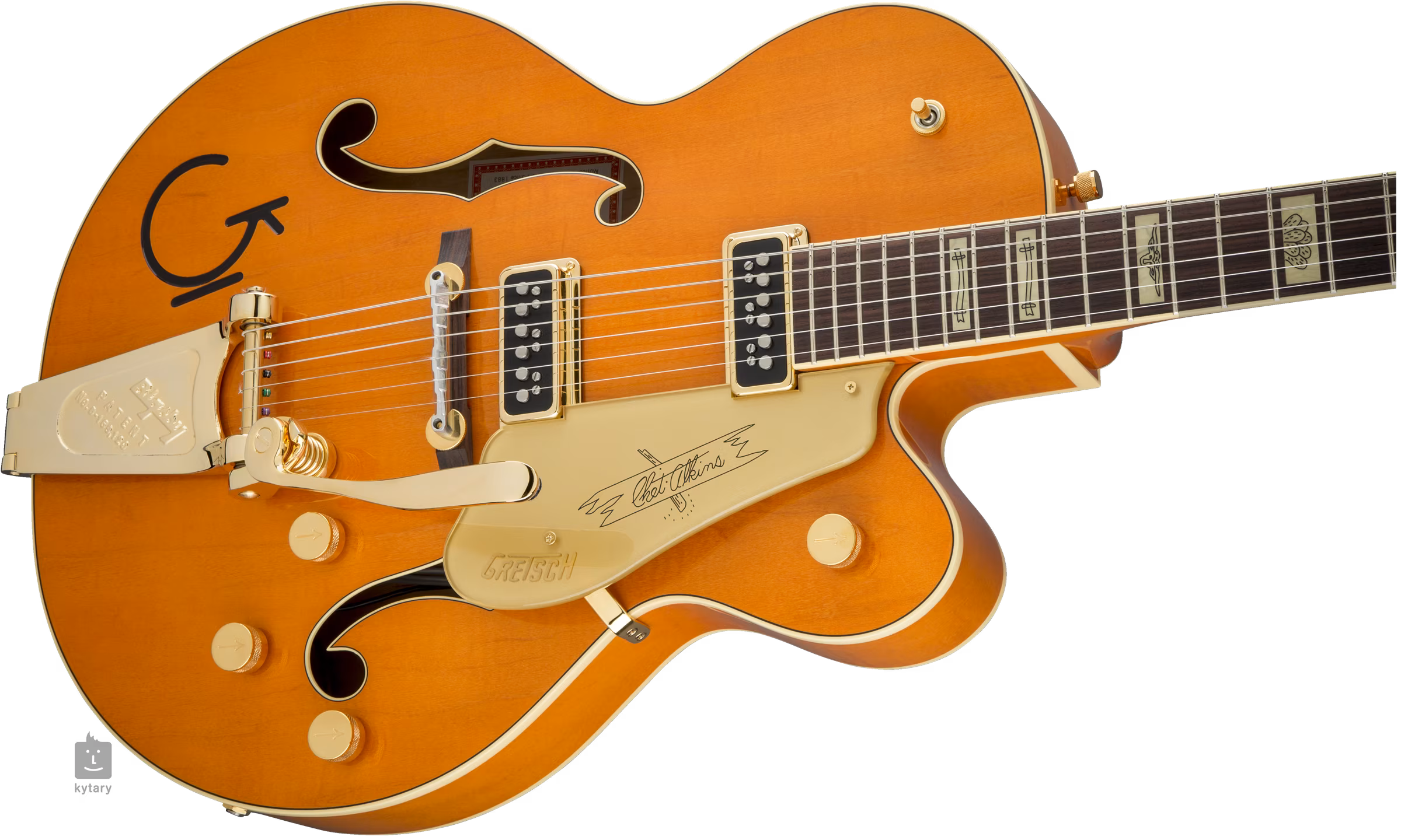 Struny umieszczone są w maszynkach do strojenia Grover Sta-Tite i tremolo Bigsby B6GBVF. Kompensowana aluminiowa podstrunnica osadzona na palisandrowej podstawie pomaga utrzymać precyzyjne strojenie. Stylowe wykończenie jest podkreślone przez trwały lakier nitrocelulozowy z połyskiem, kolorystykę Vintage Orange Stain Lacquer, białe obramowanie korpusu z czarnymi wykończeniami, aluminiowy kompensowany zerowy próg, złoty osprzęt i złoty pickguard z pleksi z czarnym logo Gretsch i podpisem Cheta Atkinsa.