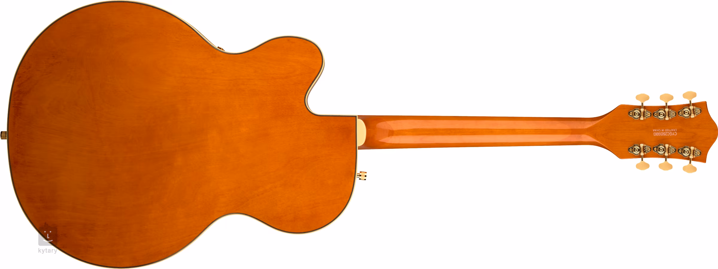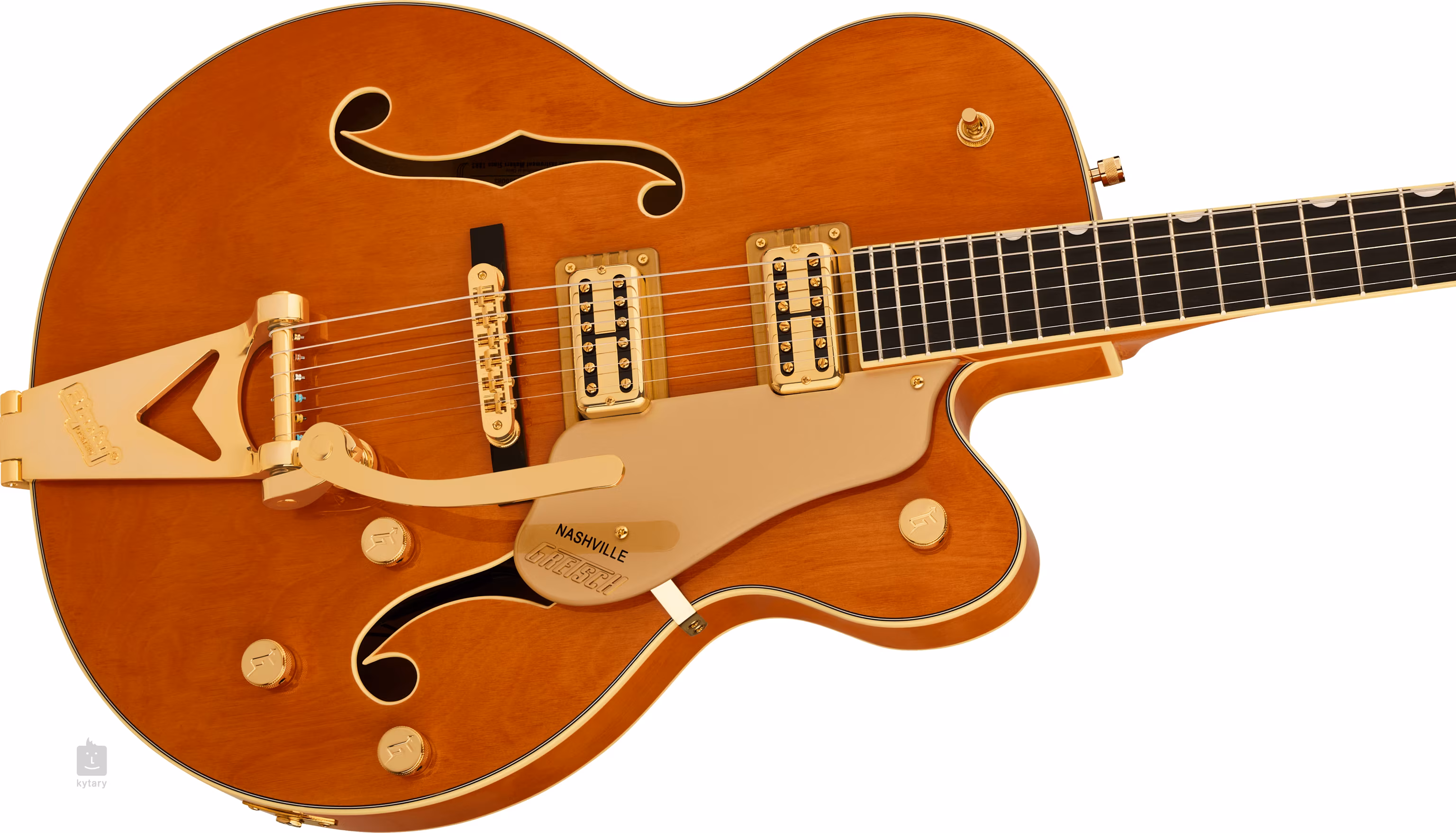 Model Synchromatic Nashville Hollow Body Single-Cut with Bigsby EB 50's Orange Stain przenosi design klasycznych gitar Gretsch 6120 w zupełnie nowe rejony. Jest to korpus o średnicy 24,6" (625 mm) i głębokości 2,5" (64 mm) wykonany z laminowanego klonu. Przód i tył są wygięte w łuk, a rezonans instrumentu jest wspierany przez ożebrowanie Semi-Arc. Do klonowej szyjki o przyjemnym profilu Soft "C" przyklejona jest hebanowa podstrunnica wyposażona w dwadzieścia dwa progi Medium Jumbo. Znaczniki pozycji wykonane z imitacji masy perłowej (Neo-Classical Thumbnail) ułatwiają orientację na podstrunnicy.