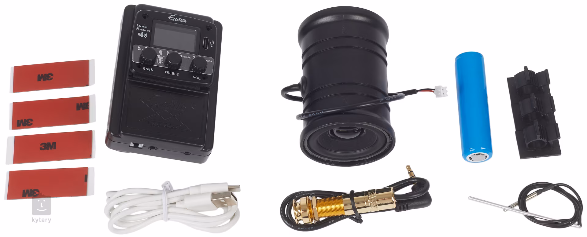 Zestaw zawiera przedwzmacniacz z dwupasmowym korektorem i zintegrowanym tunerem, przetwornik piezoelektryczny, jednostkę wibracyjną, wyjście jack, kabel USB, baterię i wszystkie niezbędne elementy montażowe.
