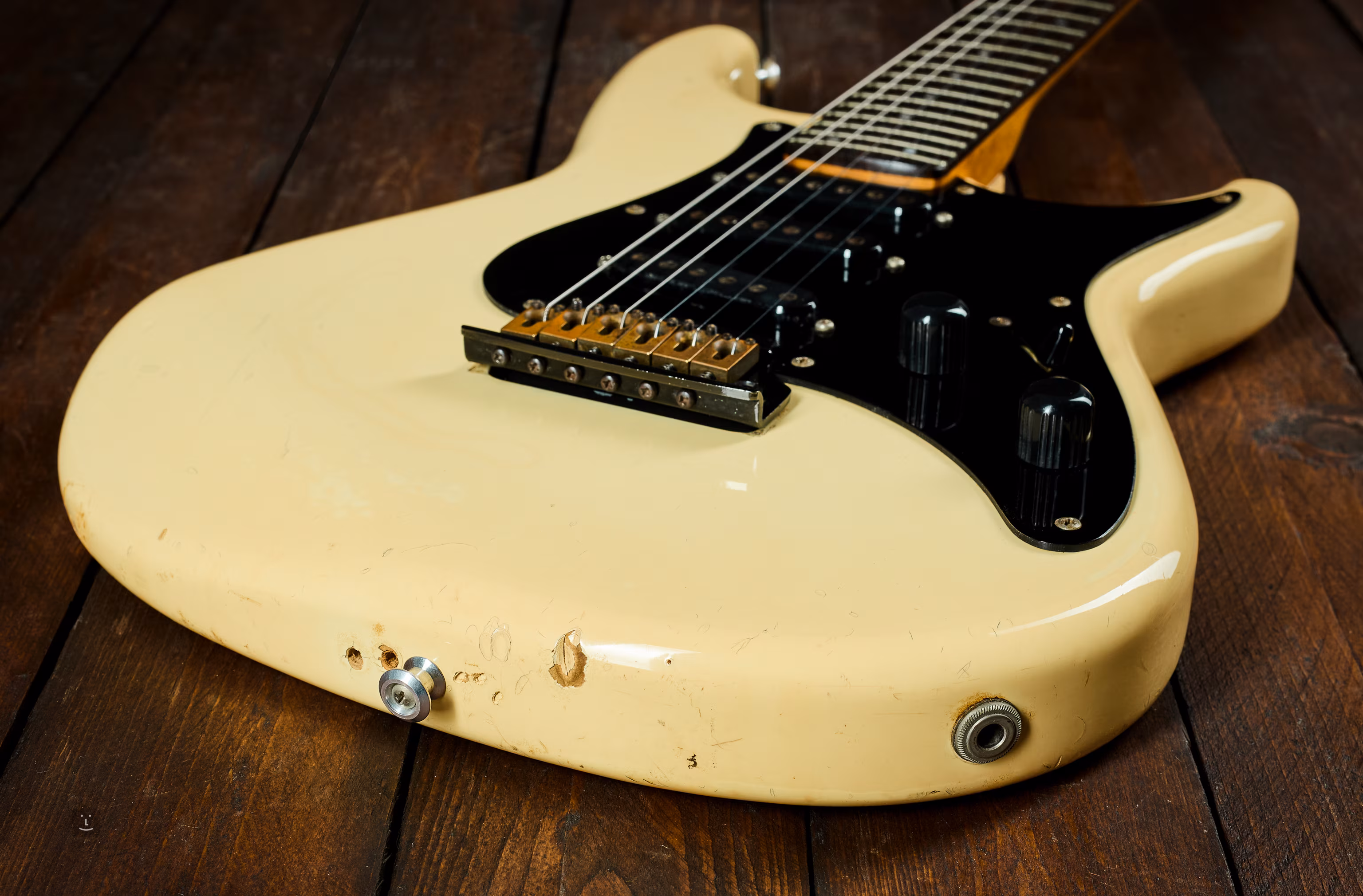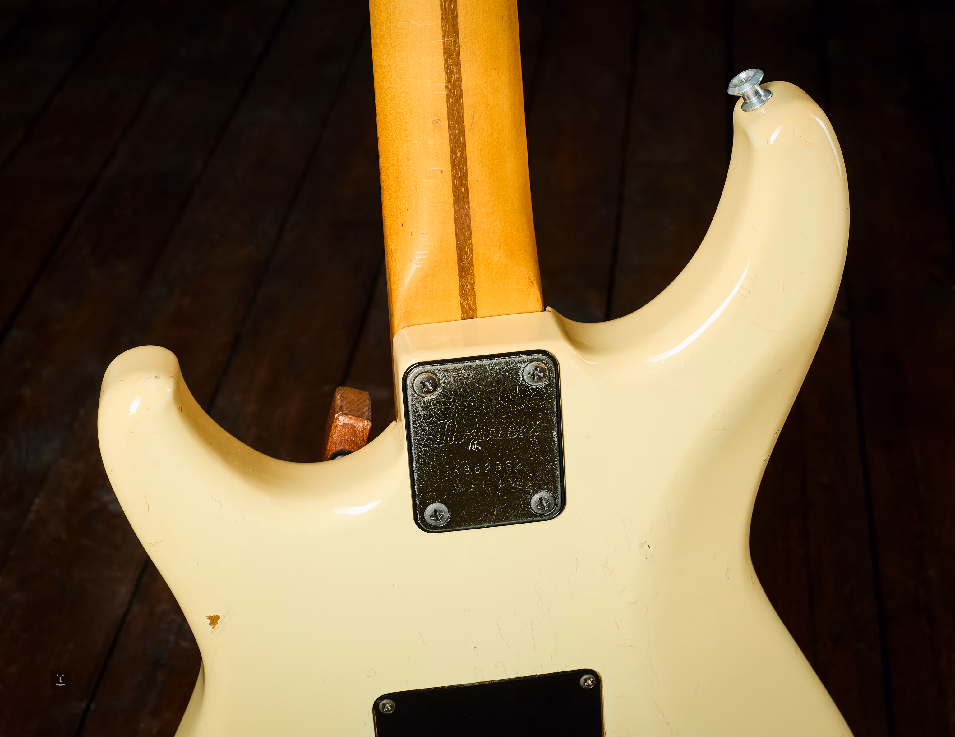 Gitara jest w doskonałym stanie. Poza rolkami na pasek i kilkoma dodatkowymi otworami wokół nich wszystko jest oryginalne. Na korpusie i gryfie znajdują się niewielkie kosmetyczne zadrapania odpowiadające wiekowi, a na górnej części korpusu kilka wgnieceń w drewnie. Jest to oczywiście towar używany!