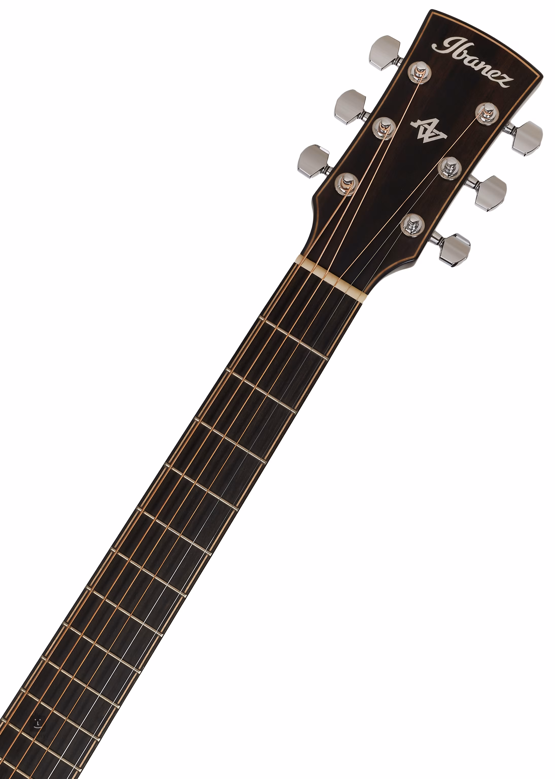 Stabilność strojenia i dobry sustain są gwarantowane przez dopasowanie strun do niebielonego, impregnowanego siodełka z kości oraz zerową liczbę progów w przekładni Gotoh 18:1 i hebanowej podstrunnicy. Wyrafinowany wygląd instrumentu podkreśla binding korpusu z klonu figuralnego, ozdobna rozeta złożona z masy perłowej (Abalone) i słojów drewna pau ferro oraz hebanowe kołki na podstrunnicy z kropkami z masy perłowej.
