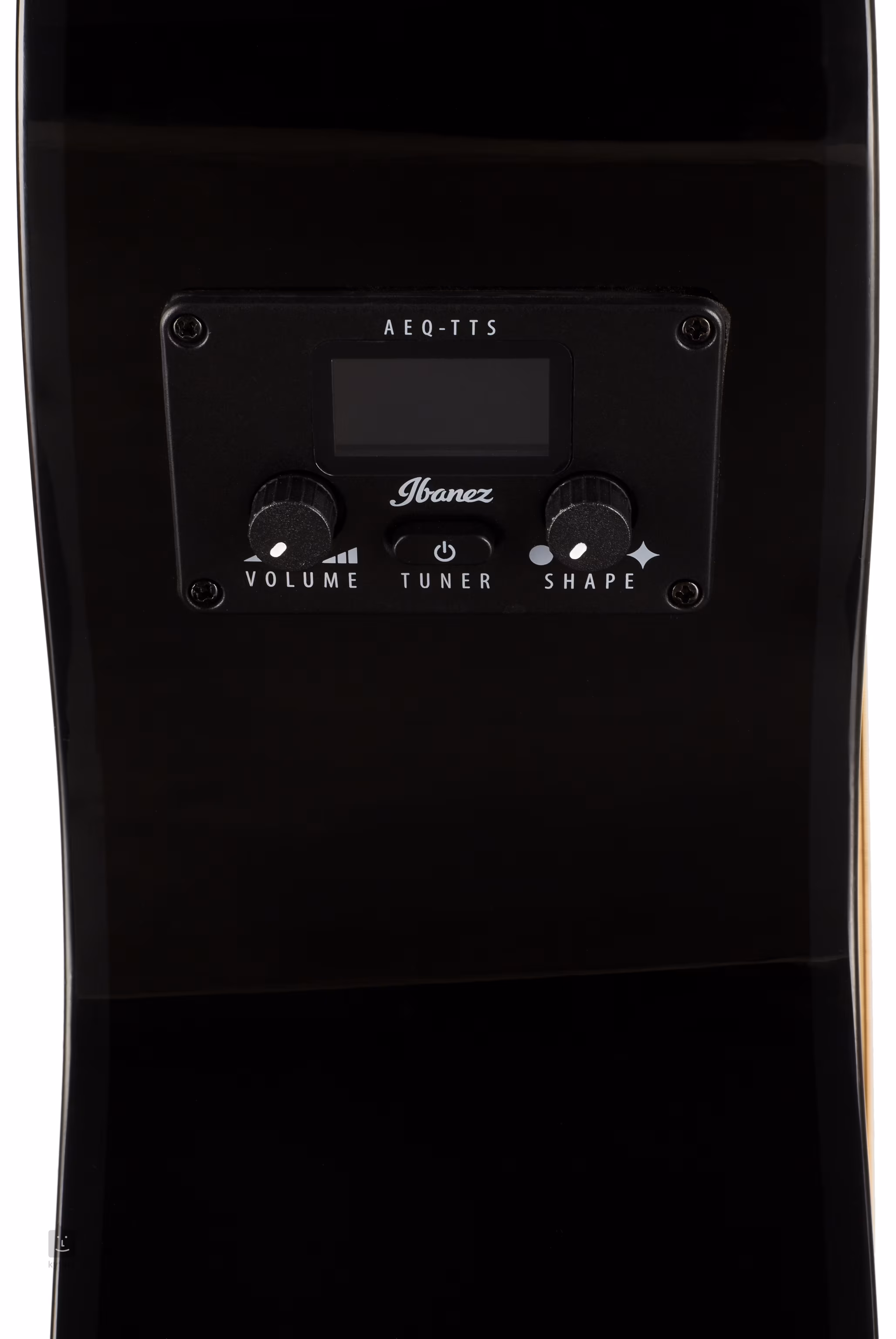 Wystarczającą głośność do występów publicznych lub gry z zespołem zapewnia elektronika Ibanez AEQ-TTS ze zintegrowanym tunerem wbudowanym w miech gitary oraz przetwornikiem piezo pod blokiem. Struny umieszczone są w chromowanych maszynkach do strojenia Die-Cast oraz na orzechowej podstrunnicy. Kołki w główce Ibaneza Advantage oferują przewagę nad standardowymi modelami pod względem łatwości obsługi i pewnego mocowania strun. Piękny wygląd przyrządu podkreślają czarno-białe listwy i rozeta, które kontrastują z kolorem nadwozia.
