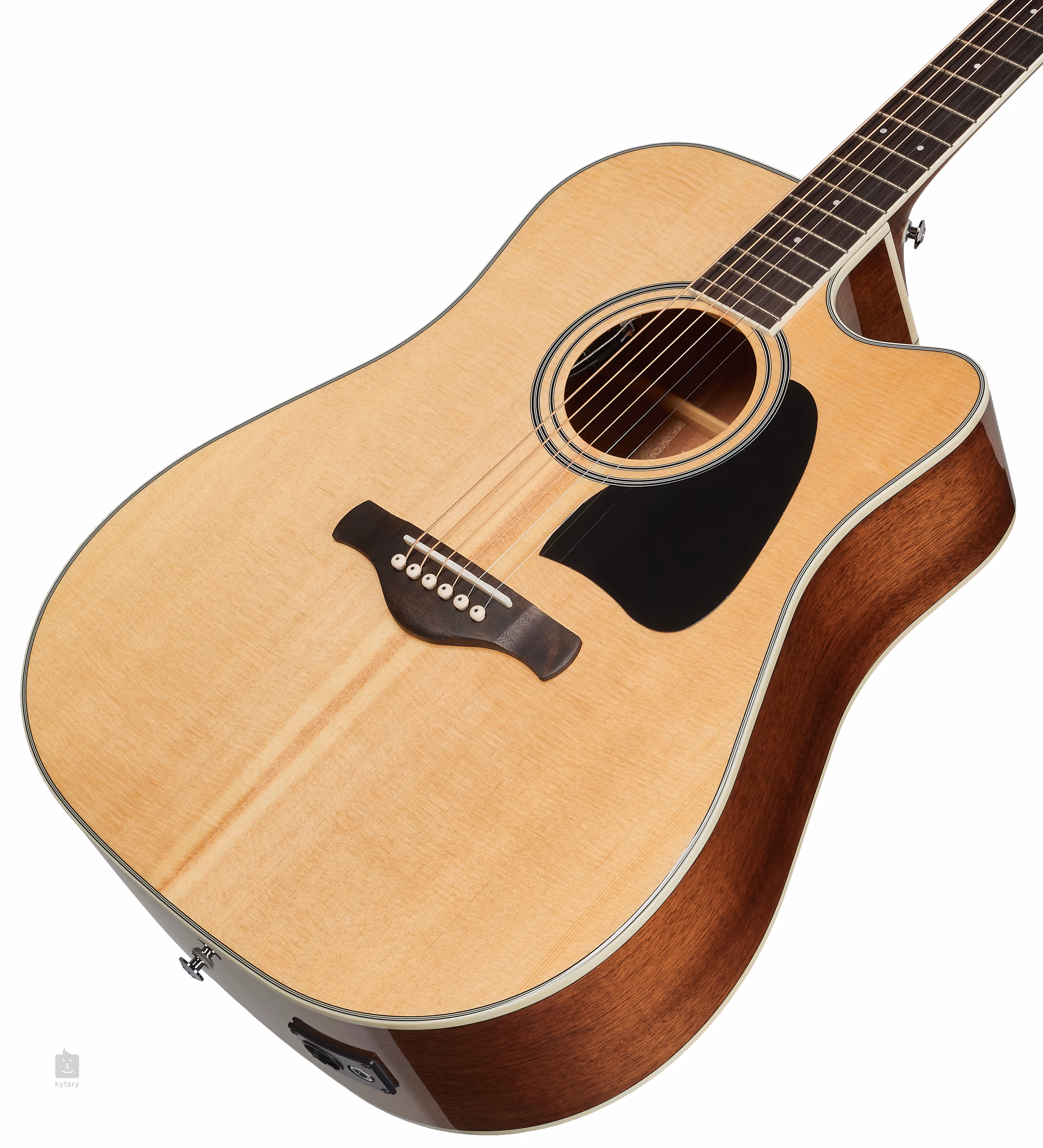 Płyta przednia modelu Dreadnought AW70ECE-NT wykonana jest z litego świerku Sitka, natomiast tył i boki ze sklejki okoumé. Do egzotycznej szyjki z nyatoh przyklejona jest 20-fretowa podstrunnica figowa. Białe kropki pozycyjne ułatwiają poruszanie się po podstrunnicy.