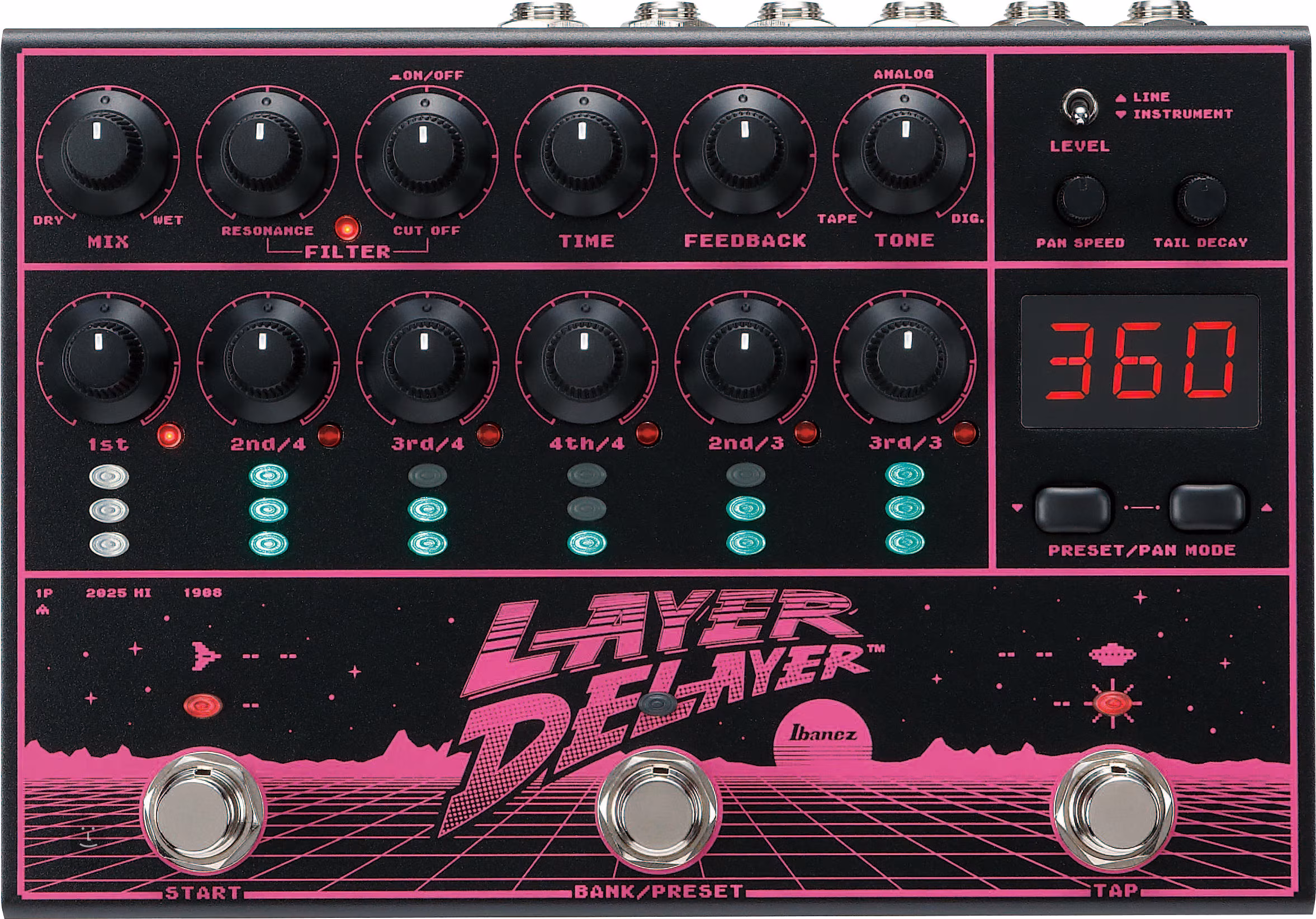 • Sterowanie 3x FS (Start, Bank/Preset, Tap), Mix, Filter (Resonance, Cut Off), Time, Feedback, Tone, Subdivision Volume (1st, 2nd/4, 3rd/4, 4th/4, 2nd/3, 3rd/3), Preset/Pan Mode, Pan Speed, Tail Decay, Level switch (Line/Instrument)