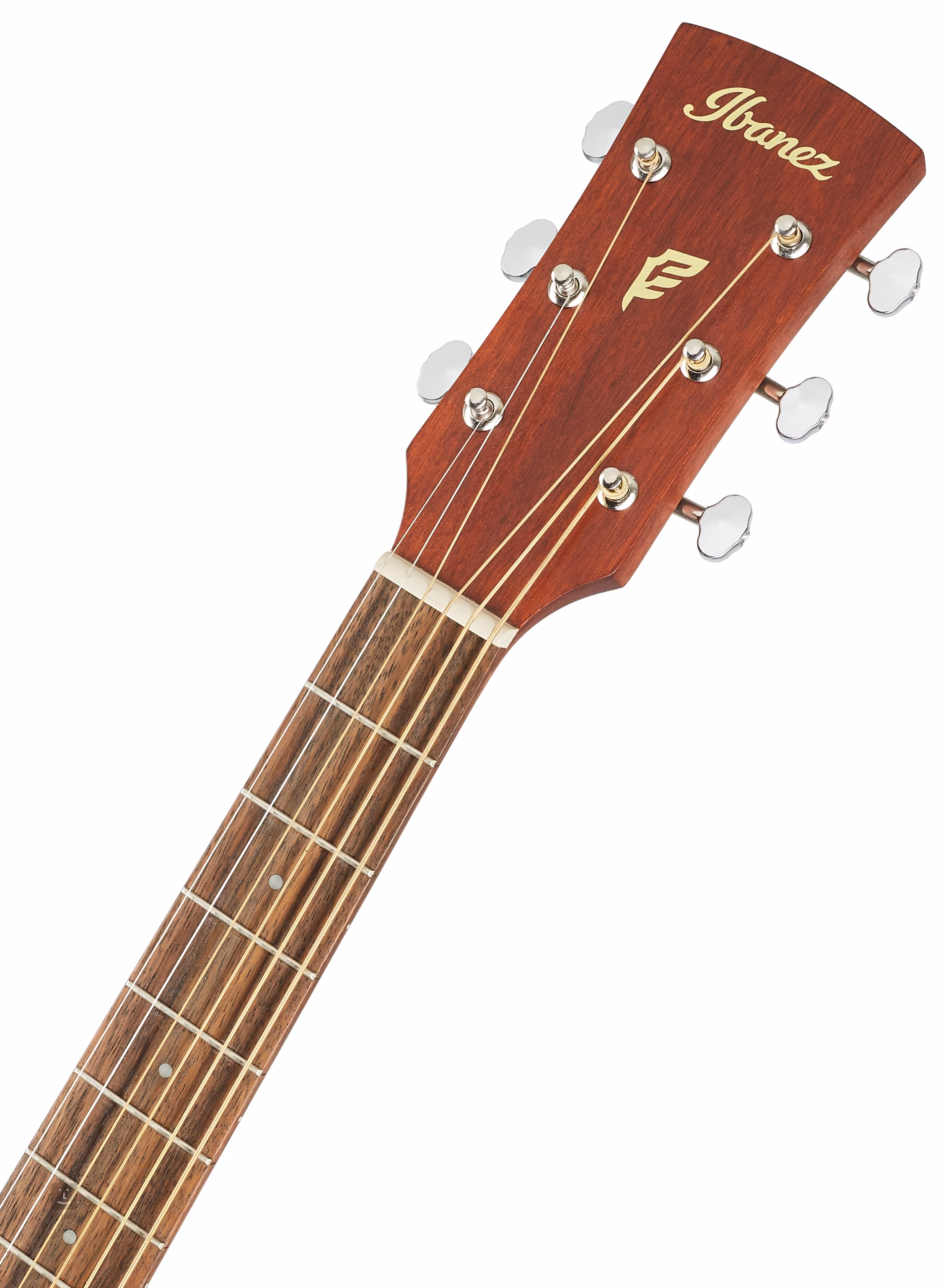 Bardziej kompaktowy korpus leworęcznej gitary elektroakustycznej typu Grand Concert PC12MHLCE-OPN wykonany jest z laminowanego drewna okoumé. Do szyjki z drewna nyatoh przyklejona jest podstrunnica z drewna figowego z dwudziestoma progami. Orientację na jego powierzchni ułatwiają białe punkty pozycyjne. Struny osadzone są w otwartych chromowanych stroikach i podstrunnicy z drewna figowego. Kołki Ibanez Advantage oferują przewagę nad standardowymi modelami w postaci łatwej obsługi i solidnego dopasowania strun.