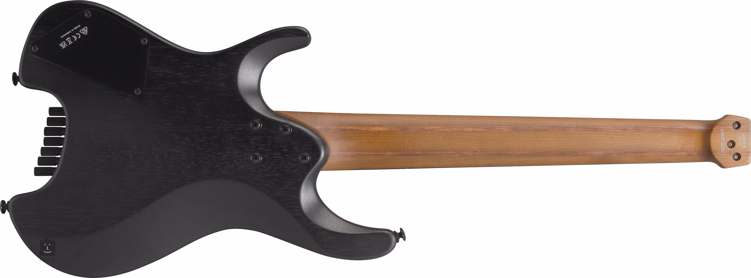 Korpus siedmiostrunowej gitary elektrycznej QX527B Weathered Black wykonany jest z drewna okoumé. Do gryfu z pięciu kawałków pieczonego klonu i egzotycznego bubingu przyklejono hebanową podstrunnicę z dwudziestoma czterema progami ze stali nierdzewnej w rozmiarze Jumbo. Skośne progi (slanted frets) ułożone na podstrunnicy pod kątem ośmiu stopni będą szczególnie odpowiadać muzykom, którzy często poruszają się w wyższych rejestrach podstrunnicy. Orientację na gryfie ułatwiają perłowe znaczniki pozycyjne (Mother of Pearl) oraz boczne kropki luminescencyjne, które zapewniają doskonałą widoczność ruchów na gryfie nawet w półmroku.