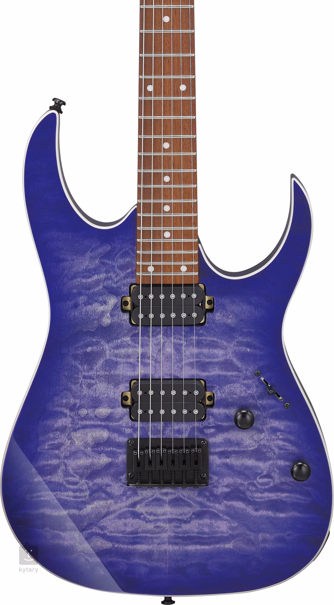 Gitary elektryczne z serii RG japońskiej marki Ibanez należą do najbardziej znanych instrumentów tego typu. Ich płaski, szybki gryf, mniejsza waga i wyraźne wycięcia z charakterystycznymi spiczastymi rogami sprawiają, że są one niezwykle popularne wśród gitarzystów rockowych i metalowych. Korpus gitary RG421QM Cerulean Blue Burst wykonany jest z drewna meranti i ozdobiony fornirem z klonu burlowego. Do szybkiego gryfu klonowego o profilu Wizard III przyklejono podstrunnicę z jatoby z dwudziestoma czterema progami typu Jumbo. Orientację na podstrunnicy ułatwiają białe kropki pozycyjne. Dwa pasywne humbuckery Quantum z ceramicznymi magnesami zapewniają gitarze zrównoważone brzmienie z szybką reakcją w basach i przebijającymi się środkami, co docenisz podczas szybszego „riffowania”. Do standardowych regulacji służą potencjometry głośności, tonów i pięciopozycyjny przełącznik przetworników, który oprócz standardowych konfiguracji oferuje również równoległe połączenie humbuckera przy szyjce w pozycji 2 i brzmienie wewnętrznych cewek obu przetworników w pozycji 4, tj. charakter single-coil. Stabilne strojenie gwarantuje mocowanie strun w firmowych mechanizmach strojących i przez stały mostek F106 przez korpus. Gitary elektryczne oznaczone jako Standard należą do podstawowych serii marki Ibanez. Są to bardziej przystępne cenowo instrumenty, które dzięki wysokiej jakości wykonania, brzmieniu i właściwościom gry przemawiają zarówno do początkujących, jak i doświadczonych gitarzystów.