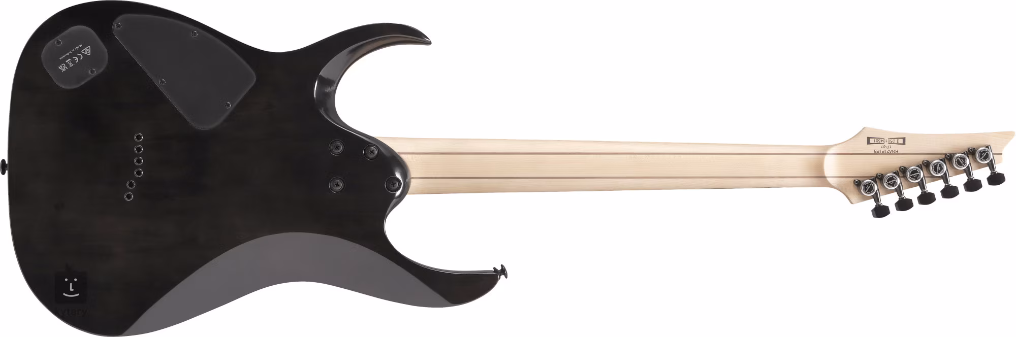 Limonkowy korpus gitary elektrycznej RGA21P1PB Deep Twilight Burst zdobi efektowna okleina topu z topoli burl oraz drewniana mozaika z klonu, orzecha włoskiego i panga panga. Hebanowa podstrunnica wyposażona w dwadzieścia cztery progi jumbo ze stali nierdzewnej jest przyklejona do przykręconej wąskiej, pięcioczęściowej szyjki z klonu i orzecha włoskiego. Większy komfort gry zapewniają zaokrąglone krawędzie progów (obróbka krawędzi progów Premium), świecące kropki z boku podstrunnicy i kropki pozycyjne z masy perłowej.