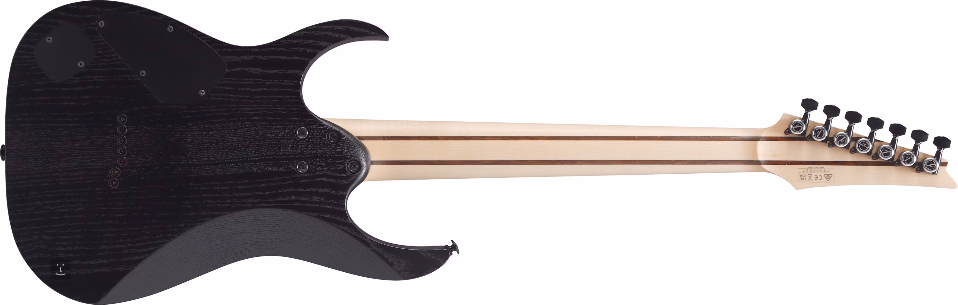 Korpus siedmiostrunowej gitary elektrycznej RGR762AHBF-WK jest wykonany z jesionu. Satynowe wykończenie w kolorze Weathered Black podkreśla rysunek jesionu. Do szybkiego gryfu o profilu Wizard-7, złożonego z pięciu kawałków klonu i wenge, przyklejono palisandrowy podstrunnicę z dwudziestoma czterema progami rozmiaru Jumbo. Ich zmodyfikowane krawędzie zapewniają większy komfort gry (Prestige fret edge treatment).