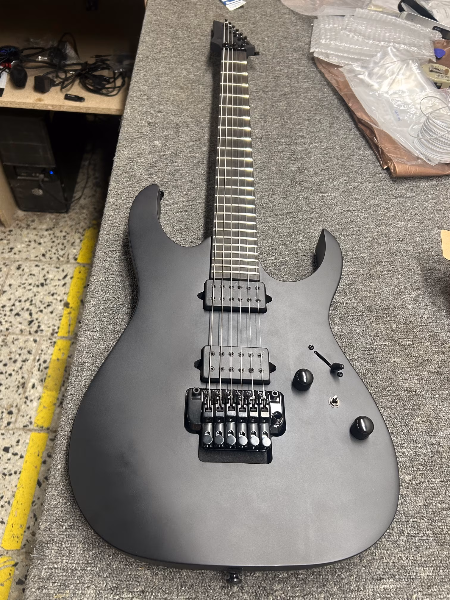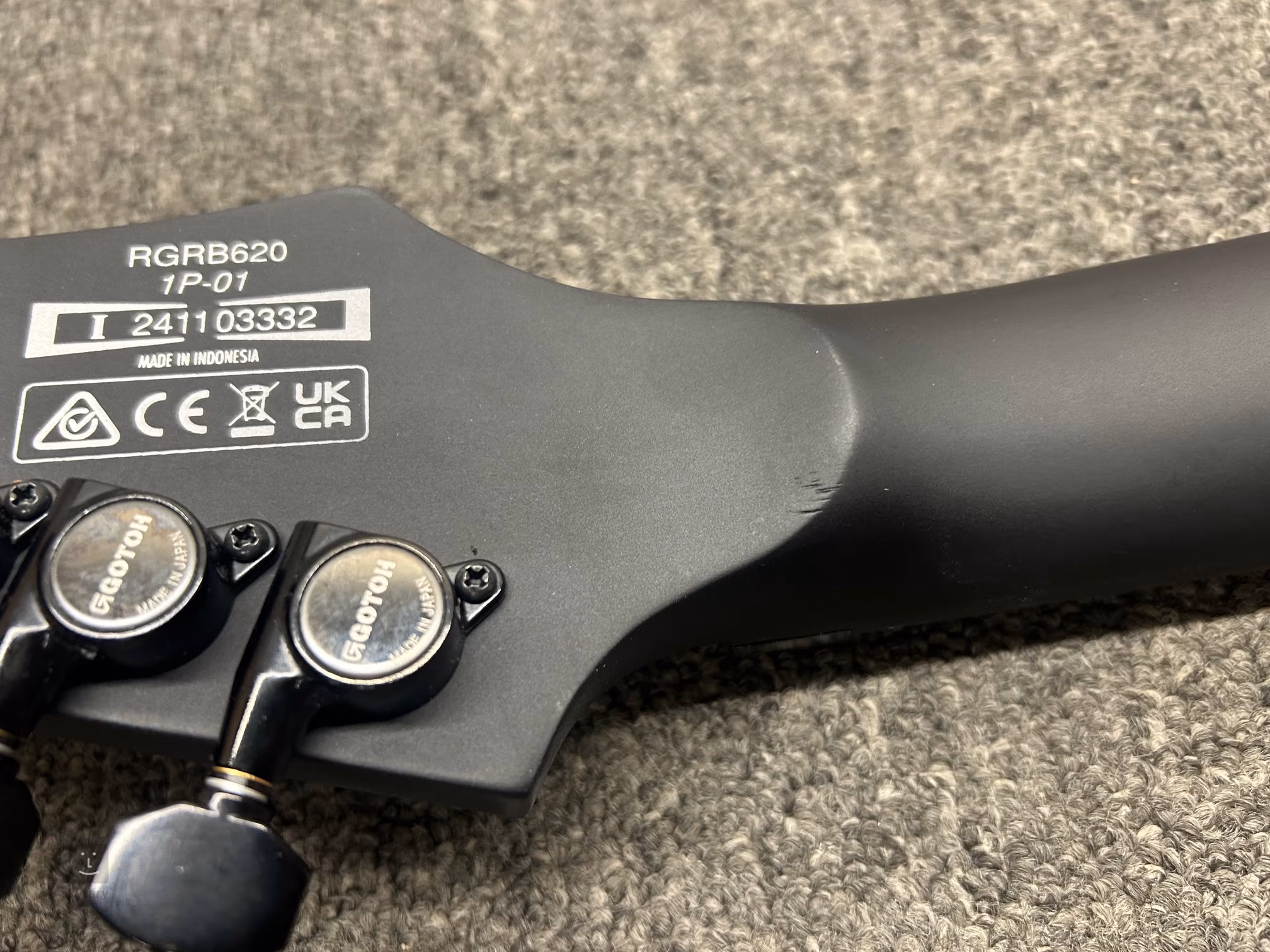Korpus modelu Iron Label RGRB620-BKF w wersji RG Super ST został wykonany z drewna nyatoh. Hebanowa podstrunnica wyposażona w dwadzieścia cztery progi w rozmiarze jumbo jest przyklejona do przykręconej pięcioczęściowej szyjki z klonu i orzecha włoskiego. Luminescencyjne kropki z boku pomagają odnaleźć drogę nawet po zmroku.