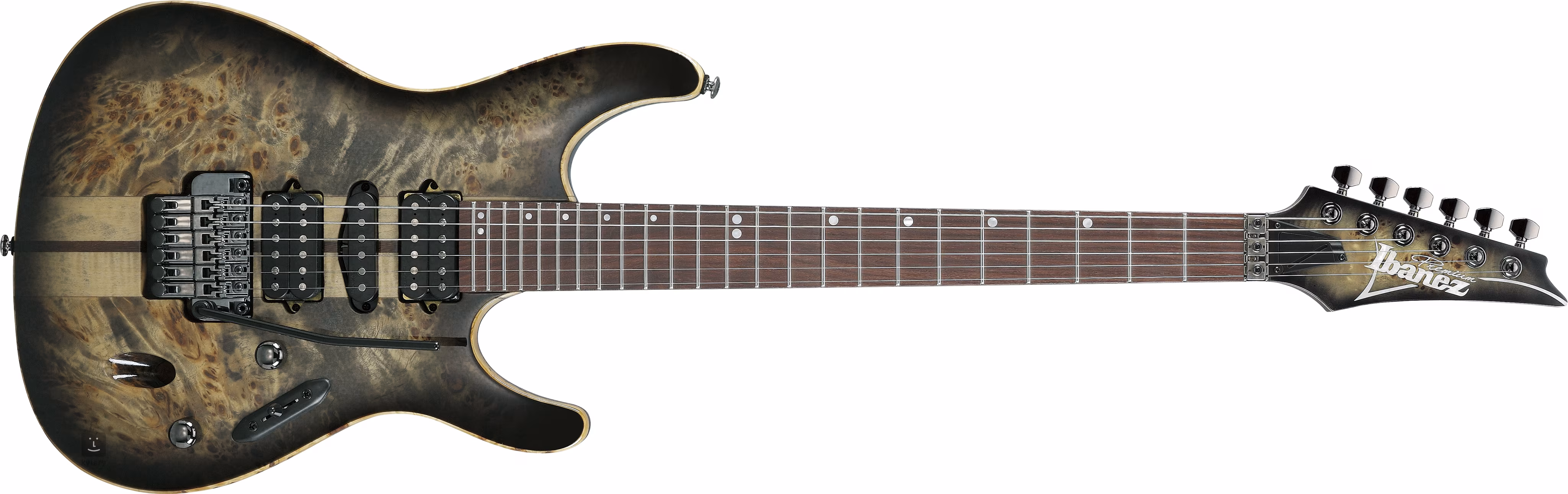 Seria S japońskiej marki Ibanez prezentuje gitary elektryczne typu Superstrat z typowymi wycięciami i ukształtowanym topem korpusu z jasnego mahoniu.