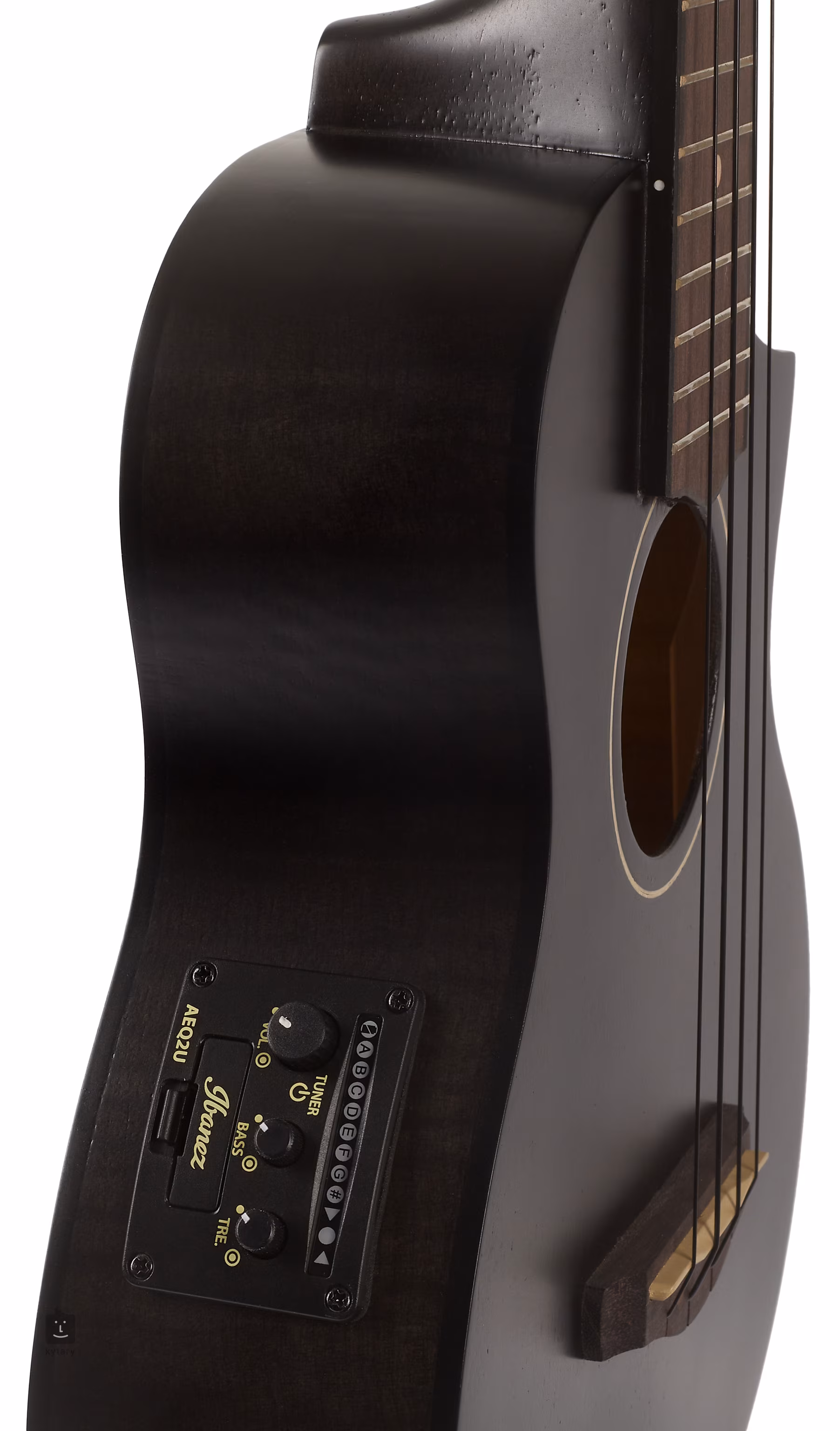 Przedwzmacniacz Ibanez AEQ2U z dwupasmowym korektorem i zintegrowanym tunerem wbudowanym w szyjkę ukulele oferuje akustyczne wzmocnienie dźwięku, dzięki czemu możesz śmiało występować z tym instrumentem publicznie. Struny są zamontowane w chromowanych tunerach Grover z czarnymi kołkami i podstrunnicą z purpurowego serca.