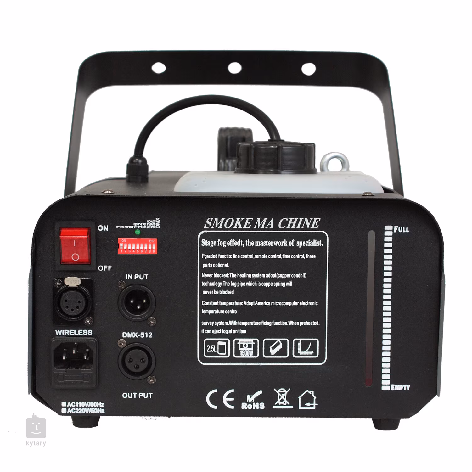 LSM1500PRO jest wyposażona w zbiornik o pojemności 2,3 litra i 1 kanał DMX, co pozwala na łatwe sterowanie i programowanie. Do urządzenia dołączone są dwa piloty, jeden przewodowy z timerem, a drugi bezprzewodowy. Przewodowy pilot może być używany do łatwego programowania i regulacji głośności, czasu i interwału produkcji dymu, co zwiększa jego praktyczność i łatwość użytkowania.