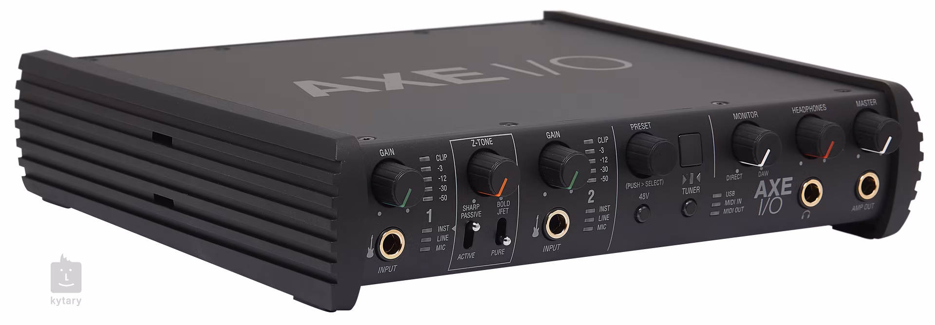 AXE I/O posiada dwa kanały z regulacją GAIN, pięć diod LED wskazujących poziom głośności oraz trzyprzyciskowy regulator wyboru sygnału wejściowego (Inst/Line/Mic). Karta dźwiękowa posiada również opatentowany obwód Z-Tone, który może dopasować impedancję (Sharp/Bold) aktywnych i pasywnych przetworników gitarowych, aby zapewnić Ci największy zakres elastyczności tonalnej. Układ oferuje również dwupozycyjny przełącznik JFET (wzmocnienie barwy harmonicznej, ostrzejsza średnica i cieplejsze brzmienie)/PURE (ultra dokładne brzmienie Twojego instrumentu) dyskretny przełącznik przedwzmacniacza. Na panelu przednim znajdziesz również pokrętło PRESET do przełączania ustawień w oprogramowaniu AmpliTube Deluxe (w zestawie), przycisk do włączania zasilania phantom, potencjometr MONITOR do miksowania sygnału wejściowego, głośność słuchawek, głośność master i zintegrowany tuner.