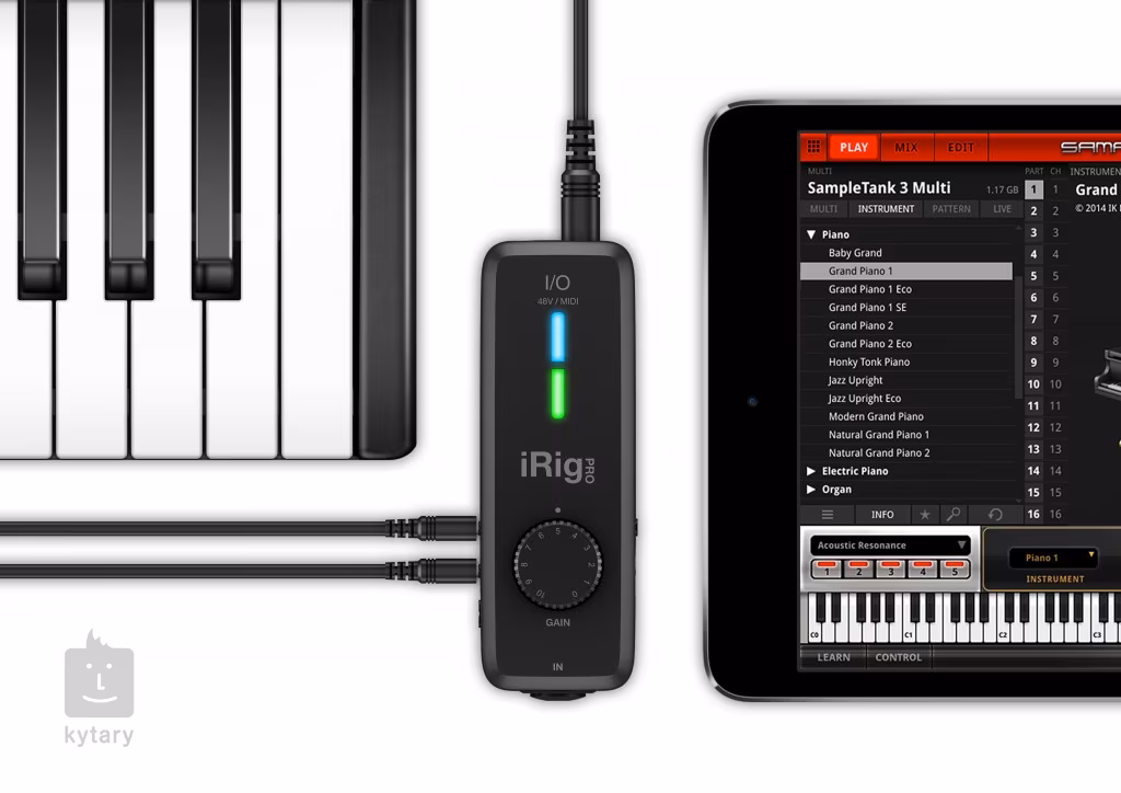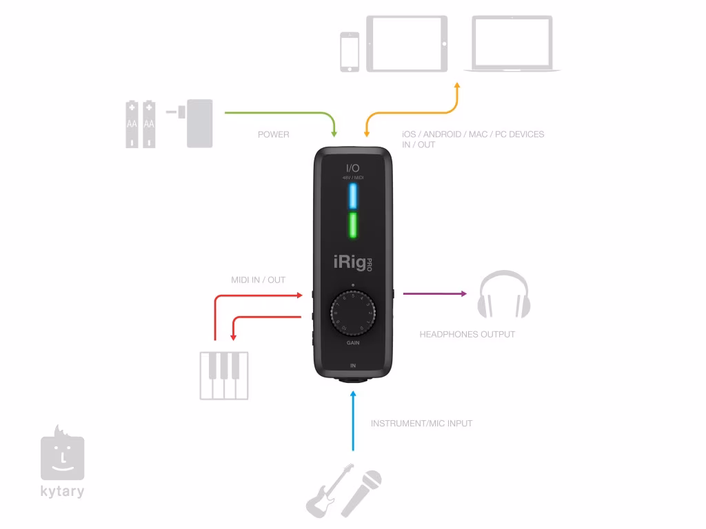 iRig PRO I/O to bogaty w funkcje kompaktowy interfejs audio/MIDI dla iPhone'a, iPada, Maca lub PC. 24-bitowe przetworniki A/D i D/A pracujące z częstotliwością próbkowania do 96 kHz gwarantują studyjną jakość dźwięku, a dzięki uniwersalnemu złączu Hi-Z (jack 6,3 mm/XLR) można nagrywać praktycznie wszystko, od wokalu, przez instrumenty elektryczne, aż po instrumenty klawiszowe. Nie musisz się również martwić o używanie mikrofonów pojemnościowych, ponieważ iRig posiada przełącznik zasilania phantom 48V. Potencjometr Gain pozwala kontrolować siłę sygnału wejściowego instrumentu/mikrofonu. Dostępne jest również wejście/wyjście MIDI, które jest doskonałym rozwiązaniem do sterowania klawiszami, kontrolerami i modułami dźwiękowymi. Zewnętrzne urządzenia MIDI można podłączyć za pomocą dołączonych 5-pinowych kabli MIDI/2,5 mm jack. Do odsłuchu służy wyjście słuchawkowe (jack 3,5 mm) wyposażone w przedwzmacniacz i regulację głośności. Samo zasilanie iRig również oferuje ciekawe możliwości. Oprócz dwóch baterii AA można skorzystać z adaptera, który pozwoli również naładować iPhone'a lub iPada. Ostatnią opcją jest zasilanie z komputera za pomocą kabla USB.