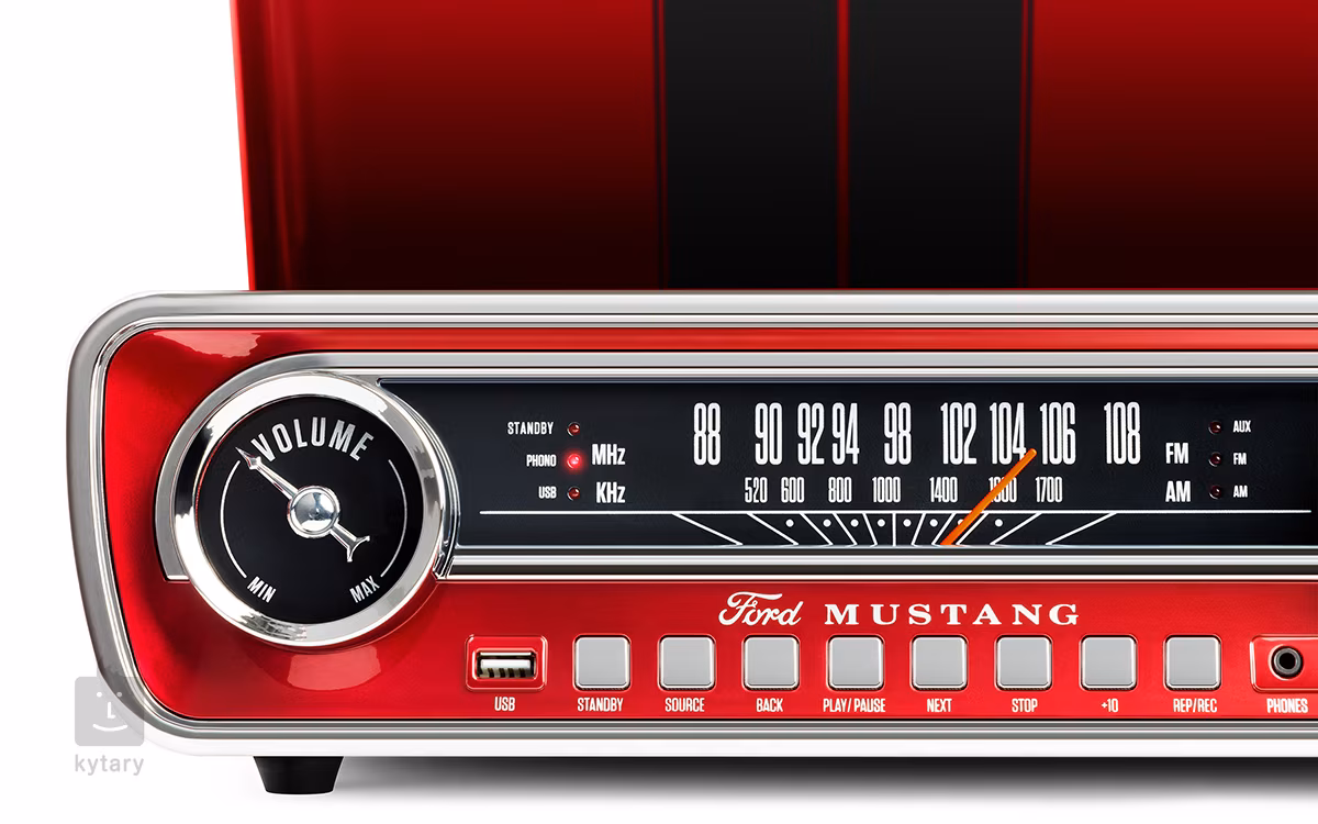 Mustang LP to ekscytujący sposób na słuchanie ulubionej muzyki z płyt LP. Wielofunkcyjny gramofon oferuje cztery funkcje w jednym. Gramofon odtworzy wszystkie rodzaje Twoich płyt, wystarczy wybrać jedną z trzech prędkości i zabawa może się rozpocząć. Muzyka popłynie z wbudowanych głośników, a wewnętrzny wzmacniacz zapewni komfortowe wrażenia słuchowe bez konieczności podłączania zewnętrznych głośników. Jednak tym, co odróżnia Mustanga LP od innych gramofonów jest luksusowy tuner radiowy AM/FM, który wygląda tak samo jak obrotomierz w klasycznym Mustangu z 1965 roku. Muzyczna rozrywka nie ma ograniczeń prędkości, więc uderzaj mocno w gaz.
