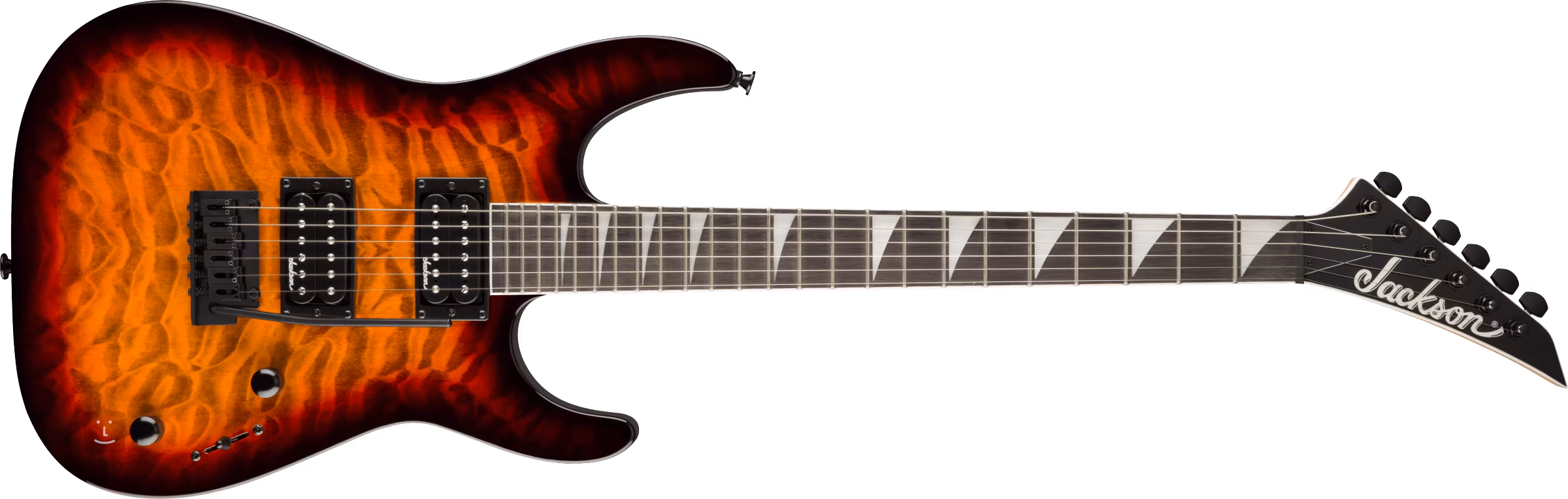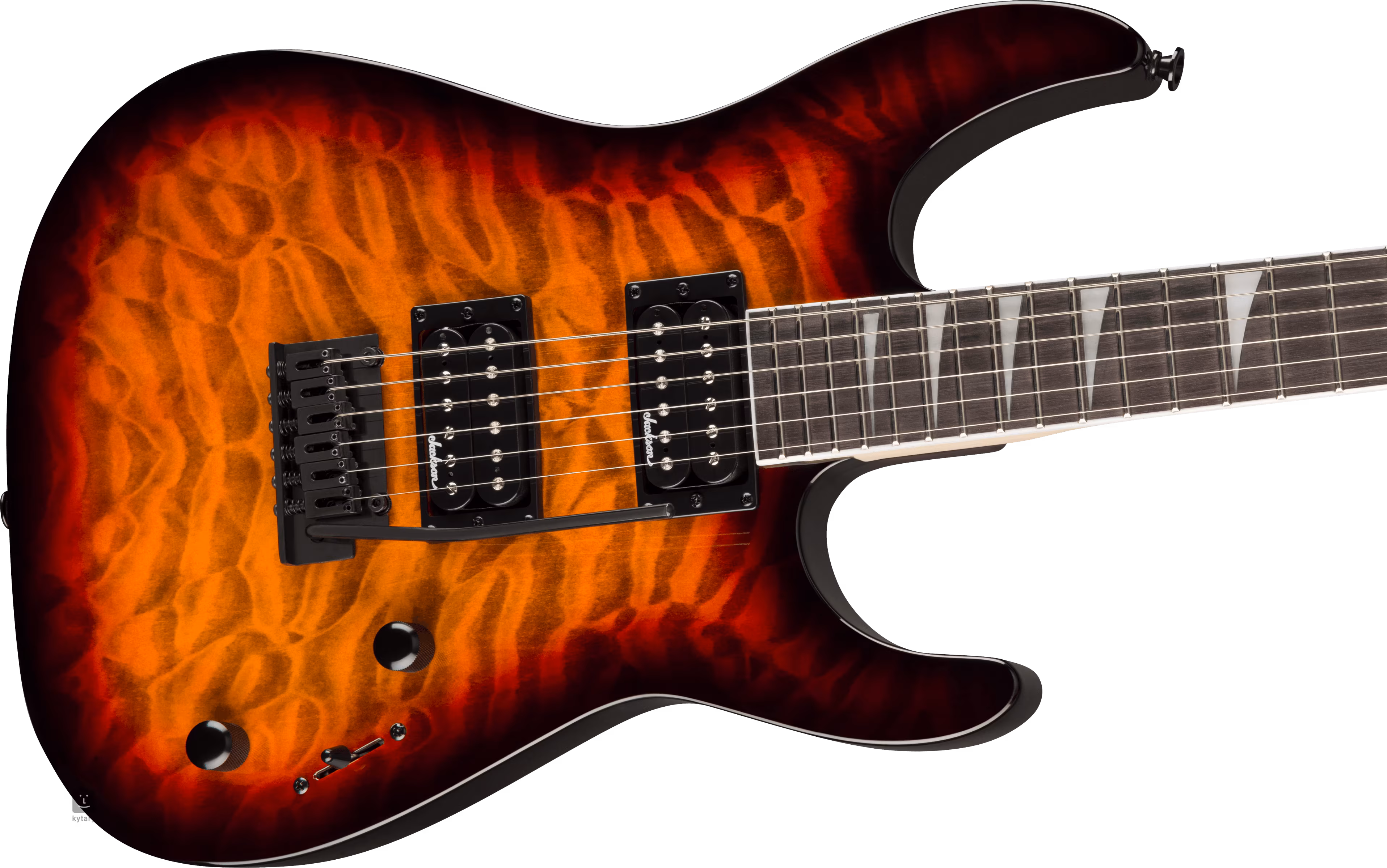 Topolowy korpus gitary JS SERIES JS20 DKQ 2PT - TR TOB jest ozdobiony wzorem/nadrukiem klonu puff. Przykręcana klonowa szyjka z grafitowym usztywnieniem jest przyklejona do amarantowej (purpleheart) podstrunnicy wyposażonej w dwadzieścia cztery progi w rozmiarze jumbo. Jej promień spłaszcza się w kierunku korpusu - umożliwiając zarówno wygodne riffowanie na progu zerowym, jak i komfortowe, ultraszybkie shredowanie na wyższych pozycjach. Znaczniki pozycji wykonane z imitacji perły Sharkfin ułatwiają poruszanie się po podstrunnicy.