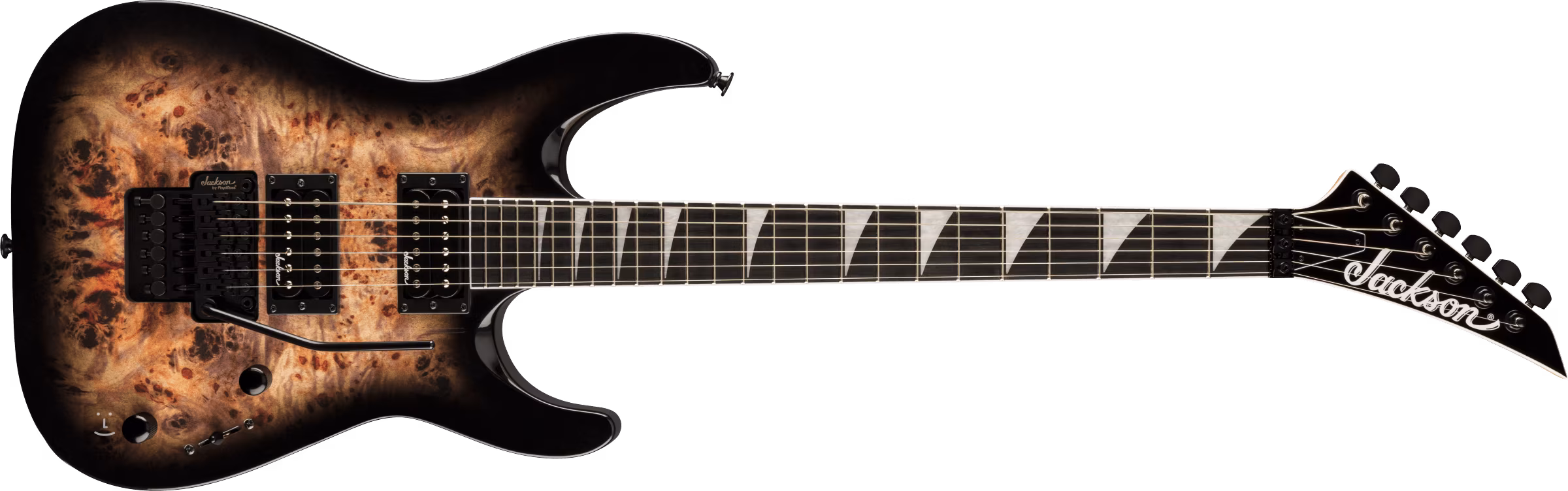 Topolowy korpus z archtopem JS SERIES JS32 DKAP - TR BLK BRST jest ozdobiony wzorem / nadrukiem korzenia topoli. Przykręcana klonowa szyjka z grafitowym usztywnieniem jest przyklejona do amarantowej (purpleheart) podstrunnicy wyposażonej w dwadzieścia cztery progi jumbo. Jej promień spłaszcza się w kierunku korpusu - umożliwiając zarówno wygodne riffowanie na progu zerowym, jak i komfortowe, ultraszybkie shredowanie na wyższych pozycjach. Znaczniki pozycji wykonane z imitacji perły Sharkfin ułatwiają poruszanie się po podstrunnicy.
