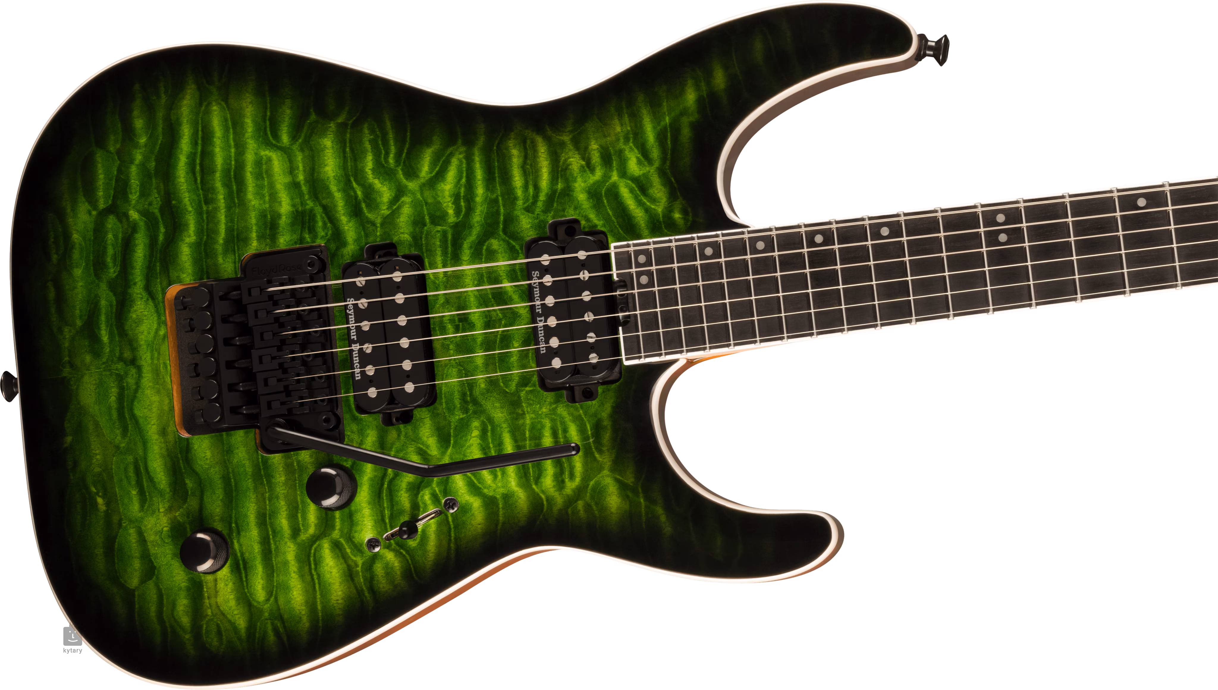 Łukowaty korpus gitary elektrycznej Pro Plus Series Dinky DKAQ Emerald Green okoumé jest ozdobiony fantazyjnym fornirem klonowym i wykończeniem Emerald Green. Hebanowa podstrunnica wyposażona w dwadzieścia cztery progi jumbo ze stali nierdzewnej jest przyklejona do przykręconej pięcioczęściowej szyjki z klonu i orzecha włoskiego wzmocnionej grafitowym usztywnieniem. Połączony promień podstrunnicy pozwala zarówno na wygodne riffowanie na progu zerowym, jak i wygodne, ultraszybkie shredowanie na wyższych progach. Orientację po powierzchni podstrunnicy ułatwiają przesunięte znaczniki pozycji wykonane z imitacji masy perłowej i świecące kropki z boku, które gwarantują doskonałą widoczność nawet w najciemniejszych obszarach sceny.