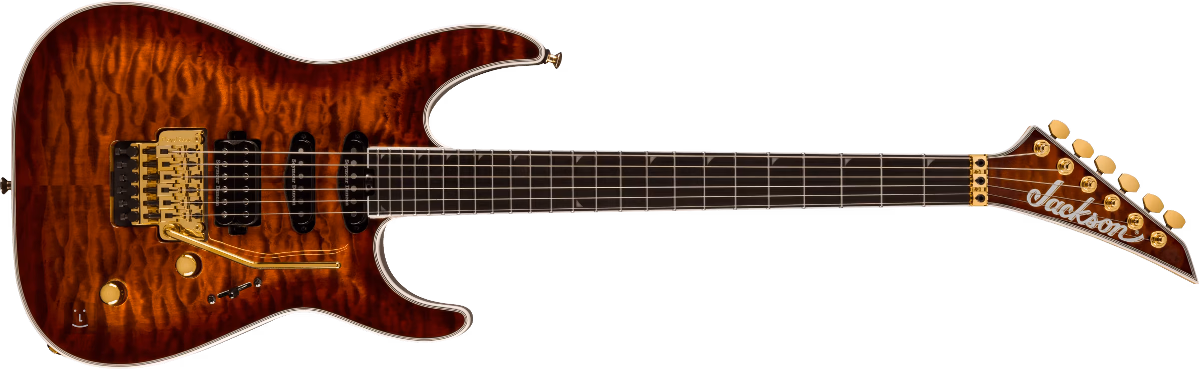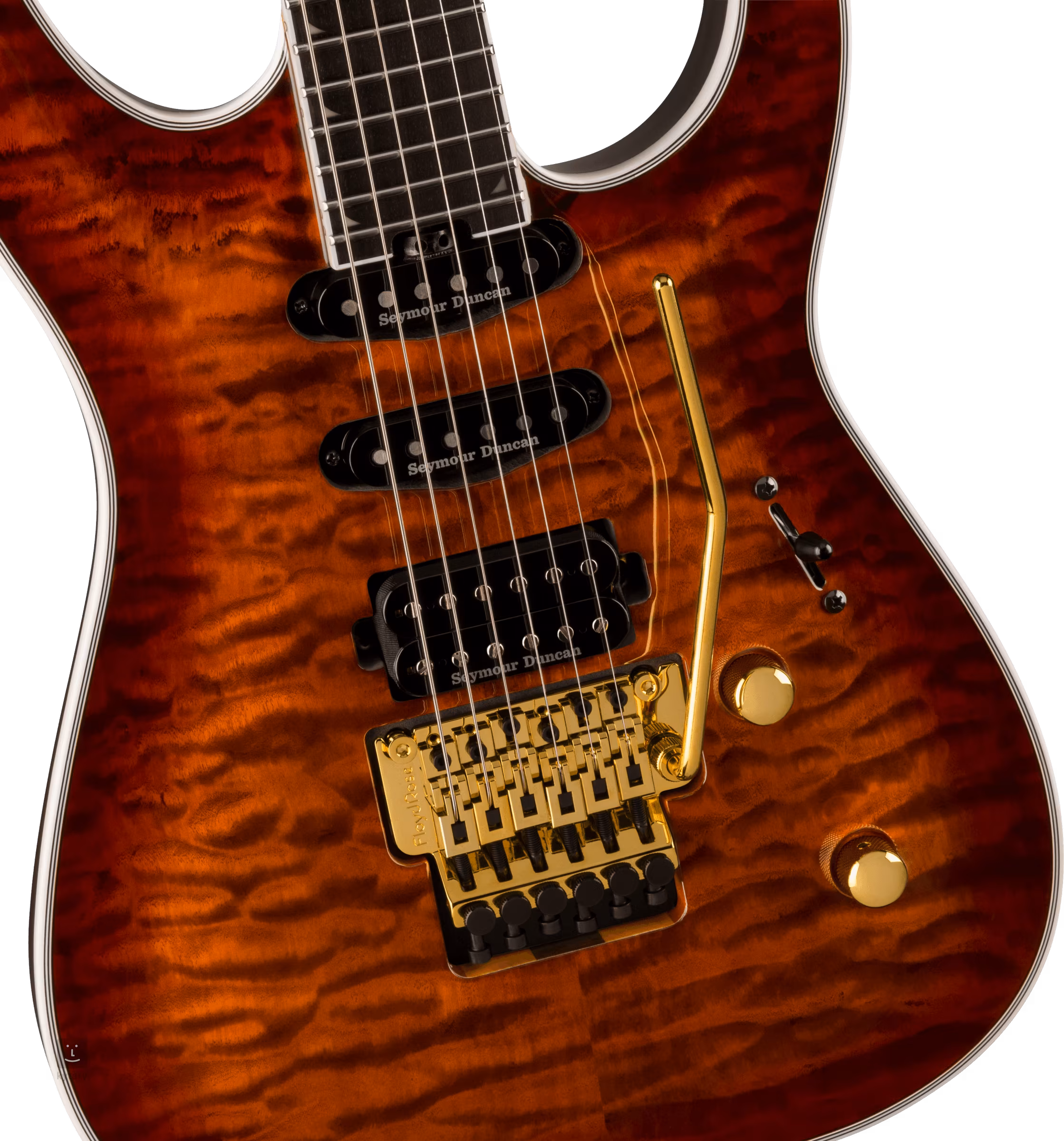 Struny osadzone są w firmowych maszynkach do strojenia oraz tremolo Floyd Rose 1000 Series. Stylowe wykończenie podkreśla kolorystyka Amber Tiger Eye i złoty osprzęt. Gitara dostarczana jest w pokrowcu.