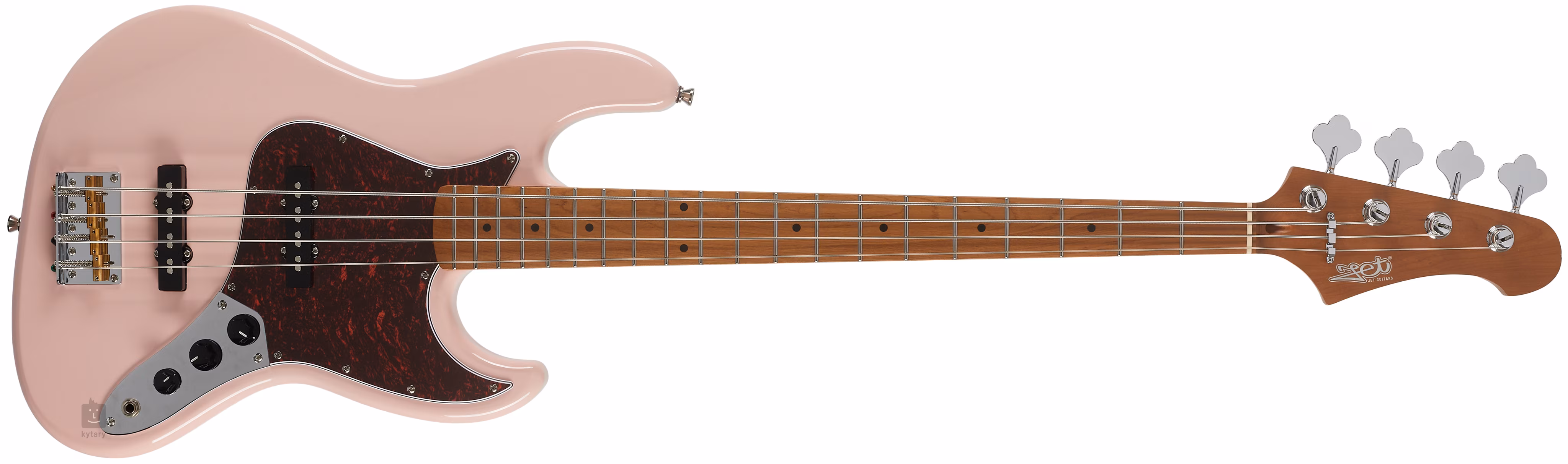 JET JJB-300 PK to niedroga czterostrunowa gitara basowa elektryczna w stylu JB. Korpus z pieczonego topoli (roasted poplar) zdobi stylowe wykończenie Shell Pink. Szyjka i podstrunnica instrumentu są wykonane z poddanego obróbce cieplnej drewna klonu kanadyjskiego. Szyjkę wzmacnia dwukierunkowa wzmocnienie, a powierzchnię gryfu dzieli dwadzieścia progów i punkty pozycyjne.