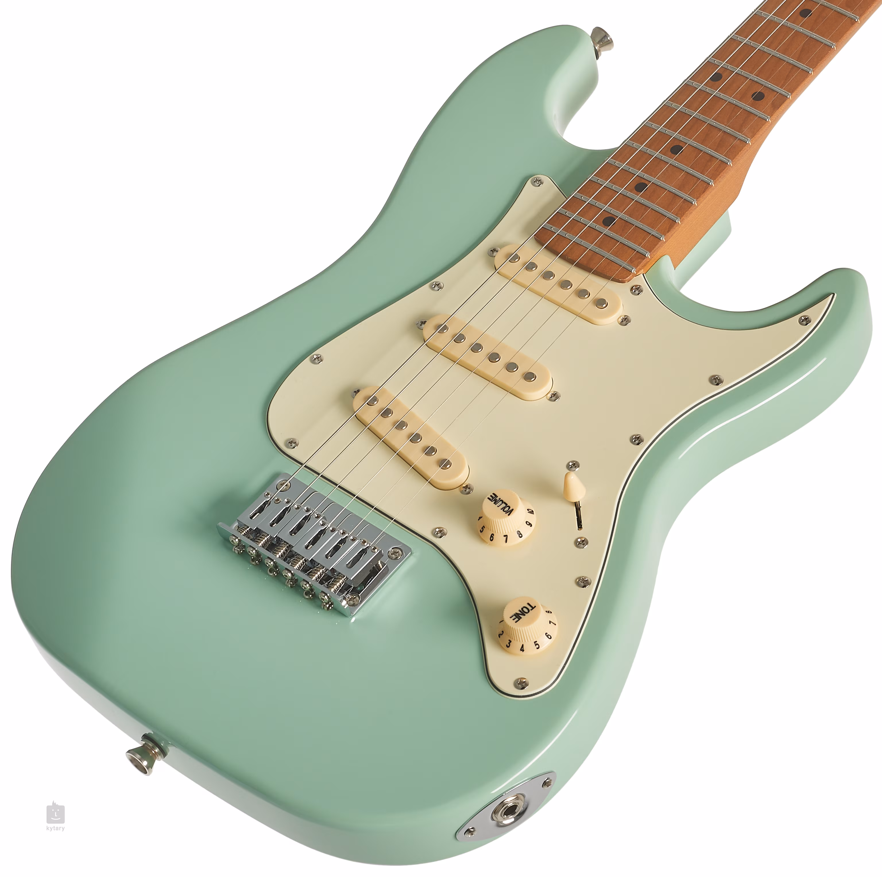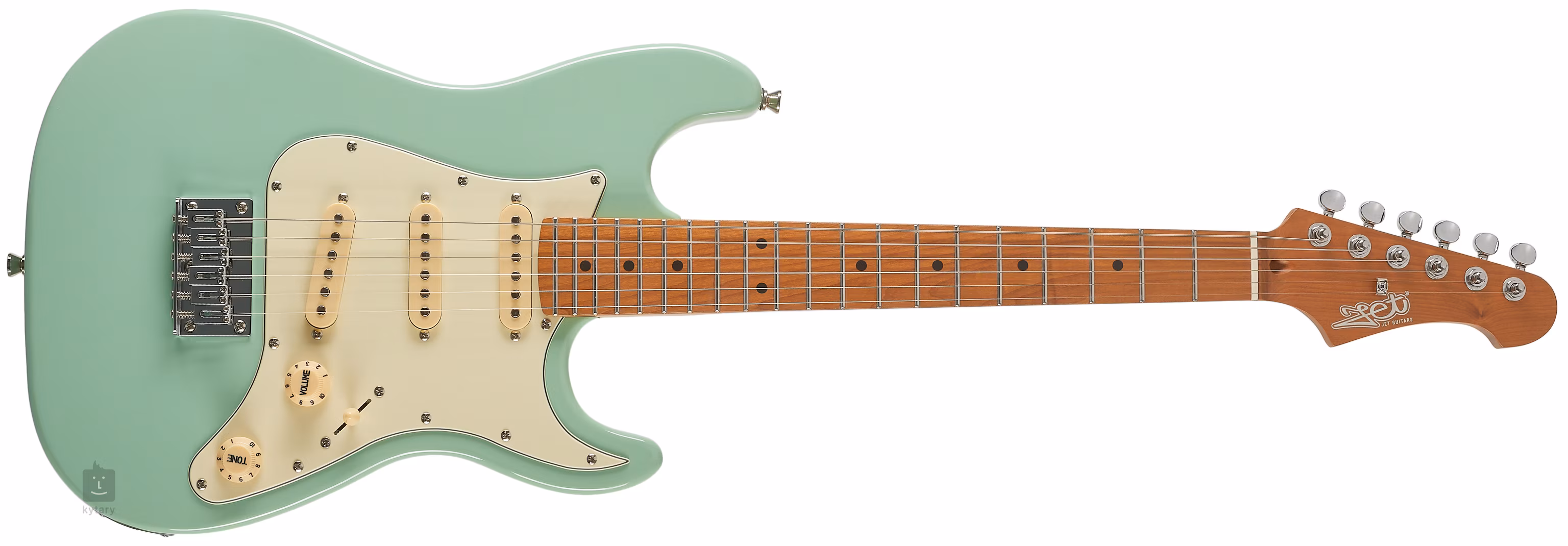 Trzy przetworniki single-coil z ceramicznymi magnesami nadają gitarze tradycyjny charakter i uderzenie modeli ST. Charakter brzmienia można kształtować za pomocą potencjometrów głośności, migawki tonów i pięciopozycyjnego przełącznika przetworników. Struny są zakotwiczone przez chromowane mechanizmy strojenia i solidną podstrunnicę - nie ma potrzeby utrudniania życia dzieciom za pomocą tremolo. Ładne wykonanie podkreśla tradycyjny pickguard i logo Jet Guitars na główce.