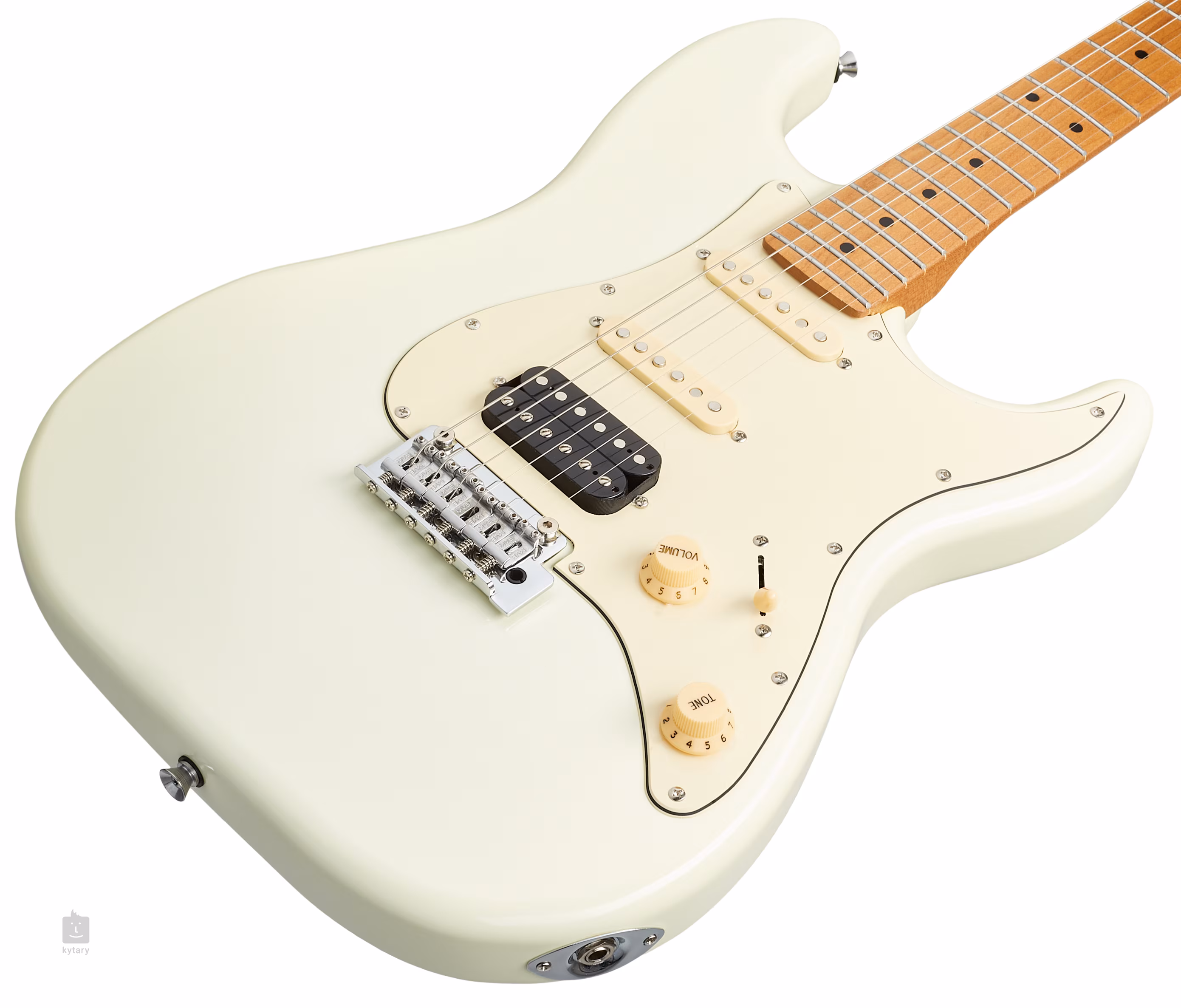 Połączenie humbuckera cobbler i dwóch przetworników single-coil z magnesami ceramicznymi zapewnia gitarze szeroką gamę brzmień odpowiednich dla wielu gatunków muzycznych. Charakter brzmienia można kształtować za pomocą potencjometru głośności, migawki tonów i pięciopozycyjnego przełącznika przetworników. Struny są zakotwiczone za pomocą kościanego progu w chromowanych maszynkach do strojenia i zsynchronizowanego tremolo. Stylowy wygląd gitary podkreśla biały pickguard. W zestawie znajduje się kabel instrumentalny.