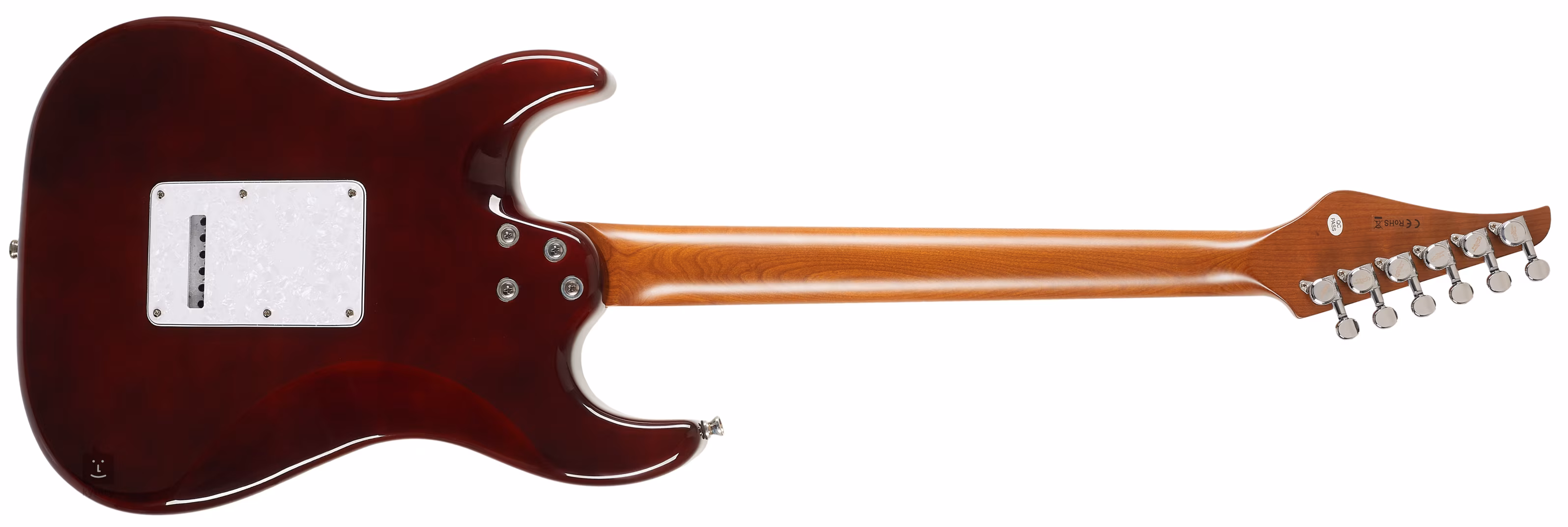 Jet JS-450Q TB R łączy w sobie elementy klasycznych modeli ST i bardziej nowoczesnych Super ST. Lipowy korpus instrumentu zdobi efektowny fornir topolowy z usłojeniem drewna wsparty wykończeniem Transparent Brown. Palisandrowa podstrunnica z dwudziestoma dwoma progami przyklejona jest do szyjki wykonanej z kanadyjskiego klonu poddanego obróbce termicznej (roasted) o profilu Modern C.