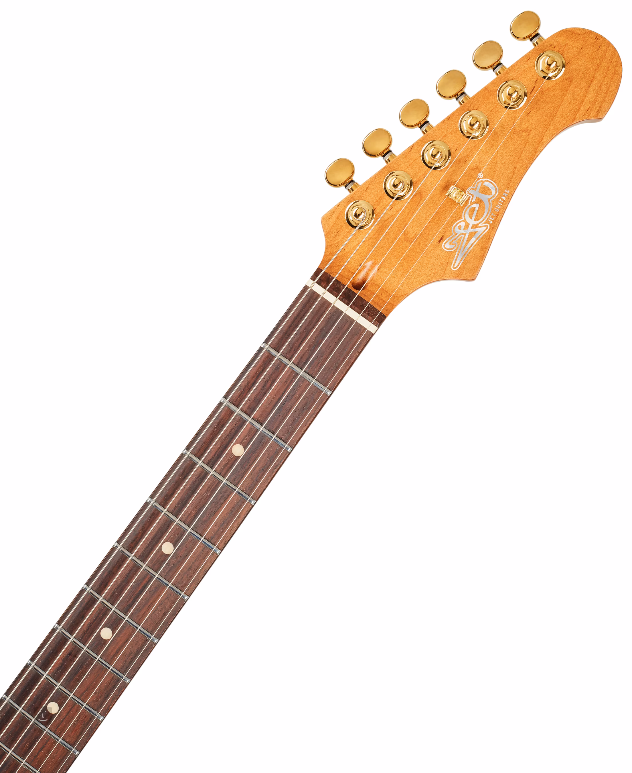 Połączenie humbuckera cobbler i dwóch przetworników single-coil z magnesami Alnico zapewnia gitarze szeroką gamę brzmień, które docenisz w wielu gatunkach muzycznych. Charakter brzmienia można kształtować za pomocą potencjometrów głośności, migawki tonów i pięciopozycyjnego przełącznika przetworników. Struny są zakotwiczone za pomocą kostnego progu w blokujących maszynkach do strojenia i zsynchronizowanego tremolo. Stylowy wygląd gitary podkreśla jasny pickguard i złoty osprzęt.